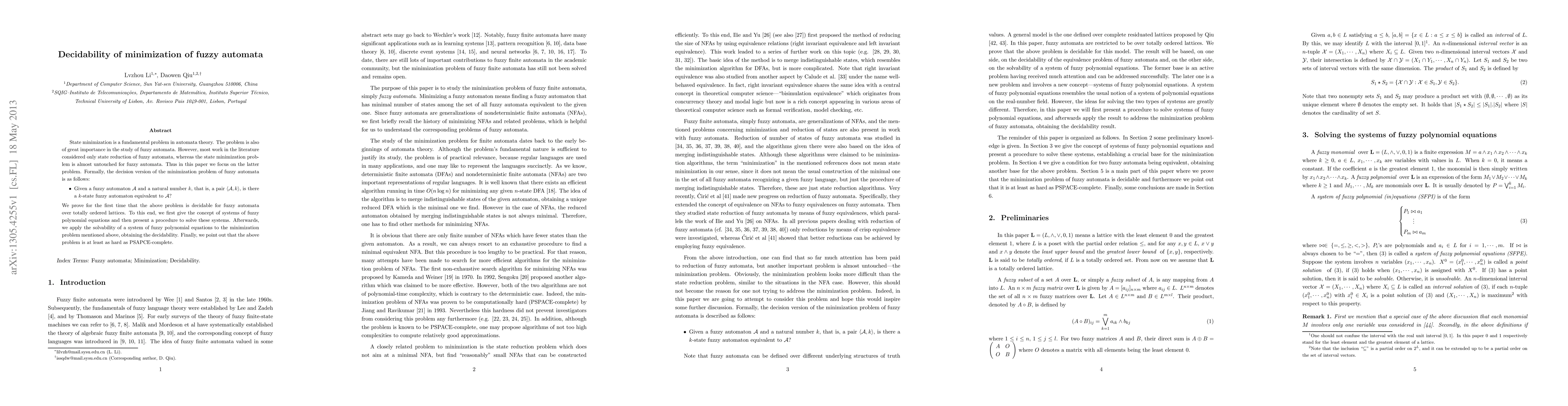 The paper proves the decidability of the minimization problem for fuzzy automata over totally ordered lattices using systems of fuzzy polynomial equations and an equivalence condition for fuzzy automata.