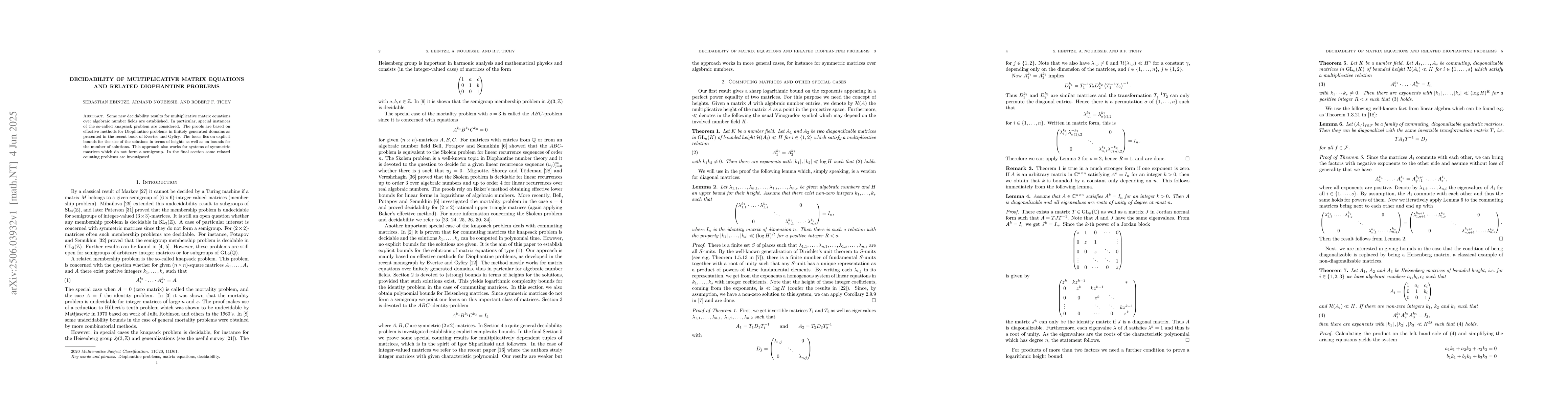Researchers establish decidability results for multiplicative matrix equations over algebraic number fields, including explicit bounds for solution size and number of solutions, with implications for the knapsack problem and related counting problems.