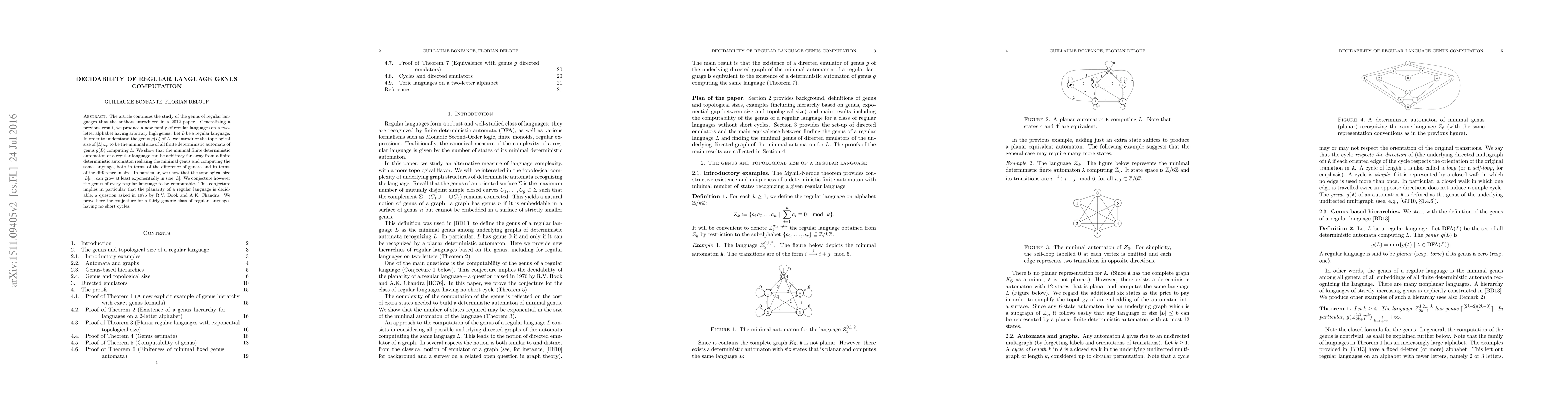 The paper studies the genus of regular languages, introducing a topological size to quantify the minimal genus of finite deterministic automata for a given language. It reveals that the topological size can grow exponentially, while proving that the genus for a broad class of regular languages without short cycles is decidable.