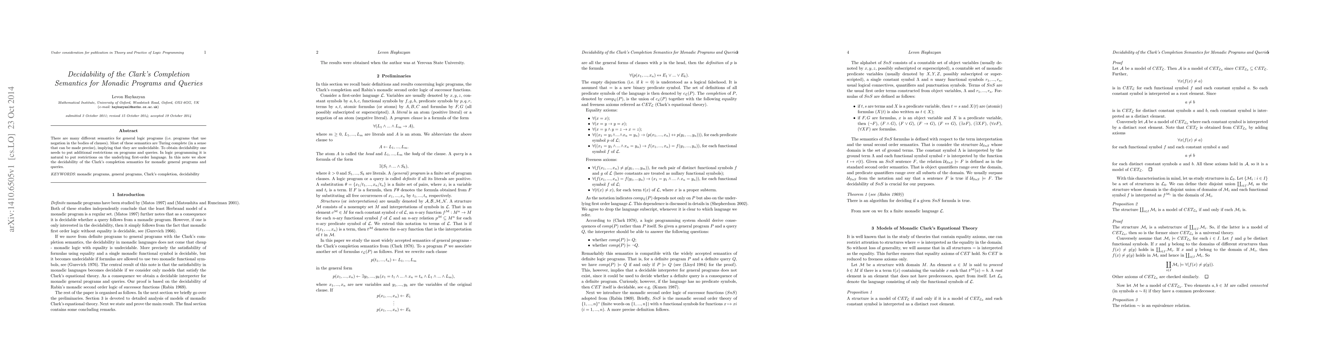 This paper demonstrates the decidability of Clark's completion semantics for monadic general logic programs and queries by imposing restrictions on the underlying first-order language. This result contrasts with the typical undecidability of more general logic programs due to their Turing completeness.