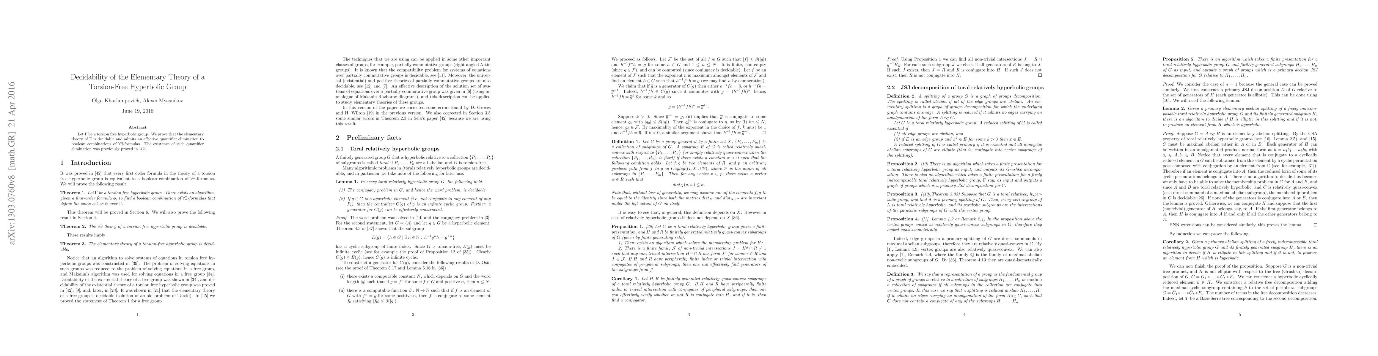 This paper proves the decidability of the elementary theory of a torsion-free hyperbolic group G and establishes an effective quantifier elimination to boolean combinations of AE-formulas, building on previous work by Sela.