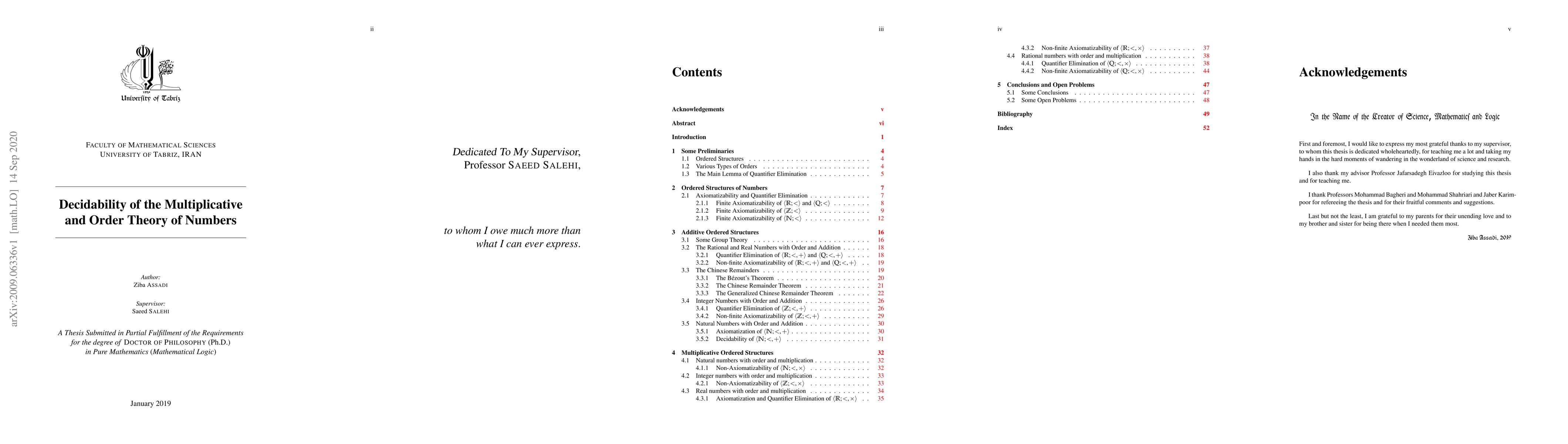 The ordered structures of natural, integer, rational and real numbers are studied in this thesis. The theories of these numbers in the language of order are decidable and finitely axiomatizable. Also, their theories in the language of order and addition are decidable and infinitely axiomatizable. For the language of order and multiplication, it is known that the theories of $\mathbb{N}$ and $\mathbb{Z}$ are not decidable (and so not axiomatizable by any computably enumerable set of sentences). By Tarski's theorem, the multiplicative ordered structure of $\mathbb{R}$ is decidable also. In this thesis we prove this result directly by quantifier elimination and present an explicit infinite axiomatization. The structure of $\mathbb{Q}$ in the language of order and multiplication seems to be missing in the literature. We show the decidability of its theory by the technique of quantifier elimination and after presenting an infinite axiomatization for this structure, we prove that it is not finitely axiomatizable.