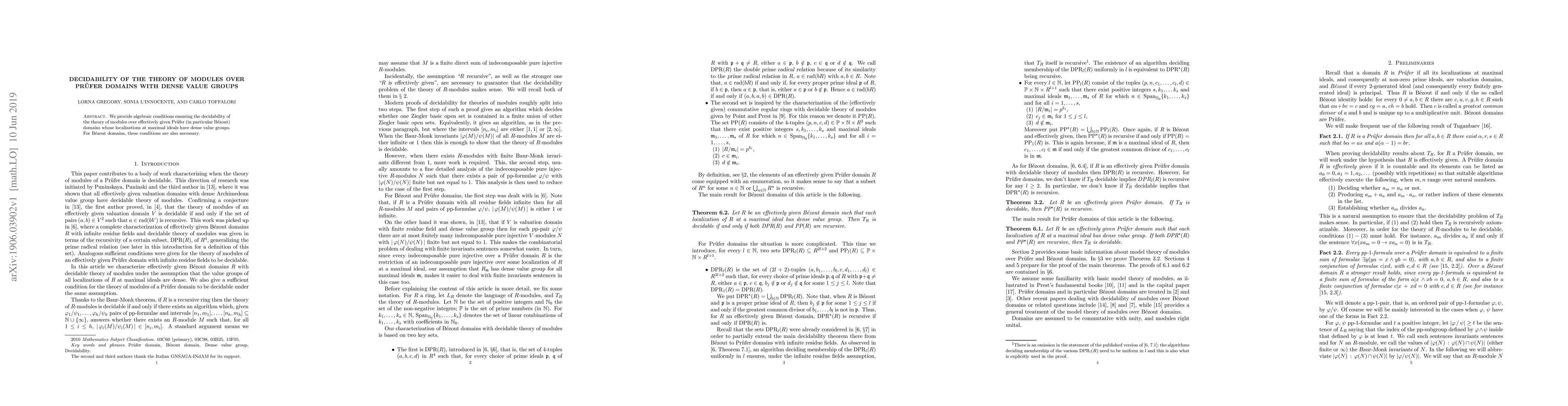 We provide algebraic conditions ensuring the decidability of the theory of modules over effectively given Pr\"ufer (in particular B\'ezout) domains whose localizations at maximal ideals have dense value groups. For B\'ezout domains, these conditions are also necessary.