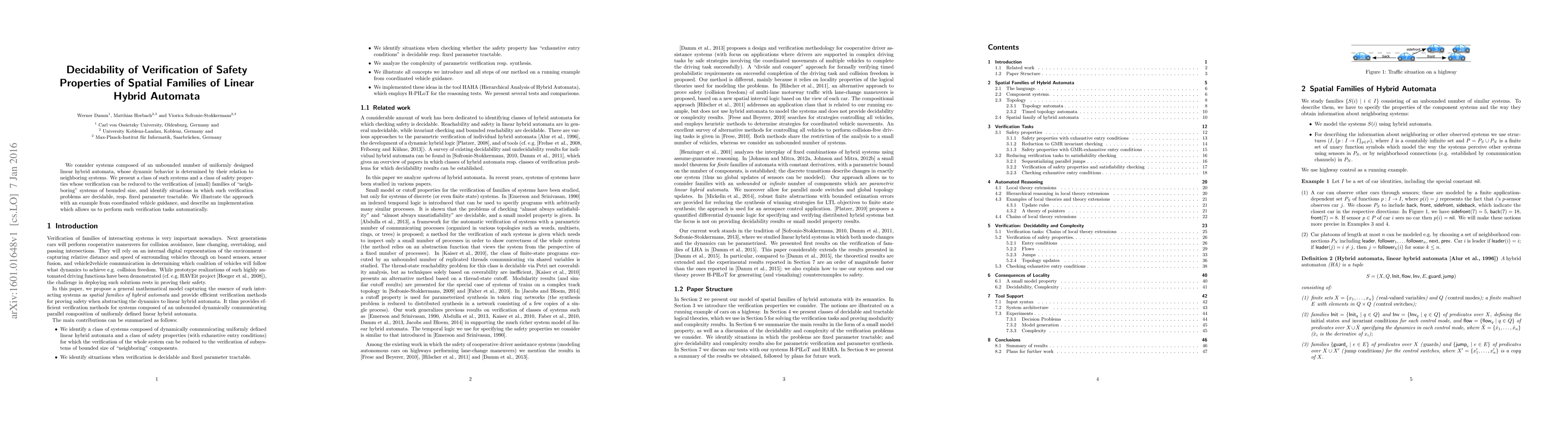 We consider systems composed of an unbounded number of uniformly designed linear hybrid automata, whose dynamic behavior is determined by their relation to neighboring systems. We present a class of such systems and a class of safety properties whose verification can be reduced to the verification of (small) families of neighbouring systems of bounded size, and identify situations in which such verification problems are decidable, resp. fixed parameter tractable. We illustrate the approach with an example from coordinated vehicle guidance, and describe an implementation which allows us to perform such verification tasks automatically.