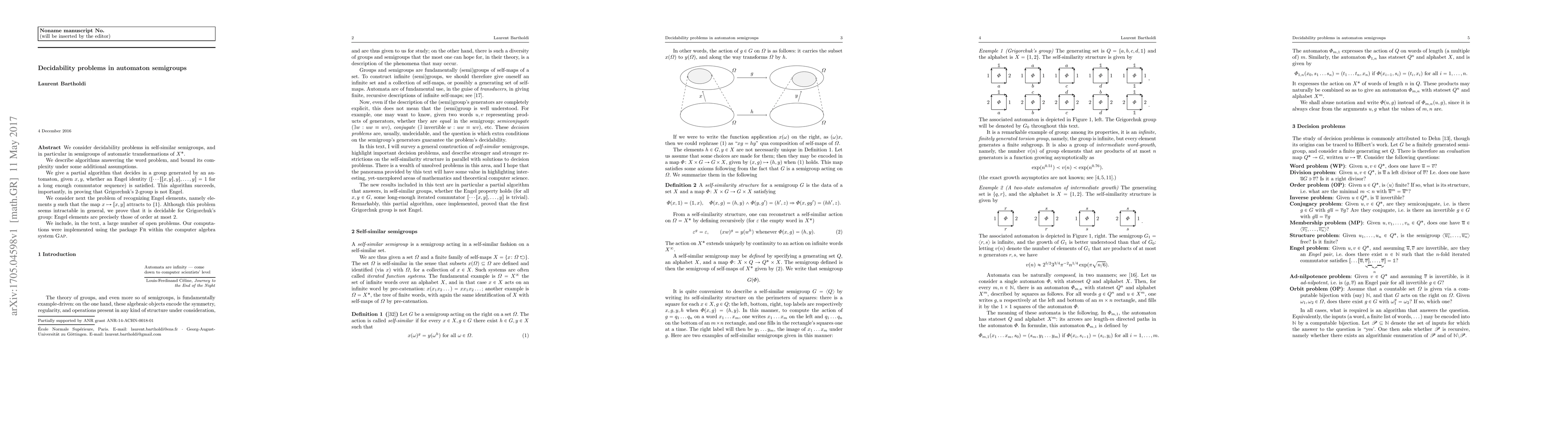 Researchers solved decidability problems in self-similar semigroups, including the word problem for certain groups, and made progress on recognizing Engel elements, a key property that distinguishes Grigorchuk's 2-group from other groups.