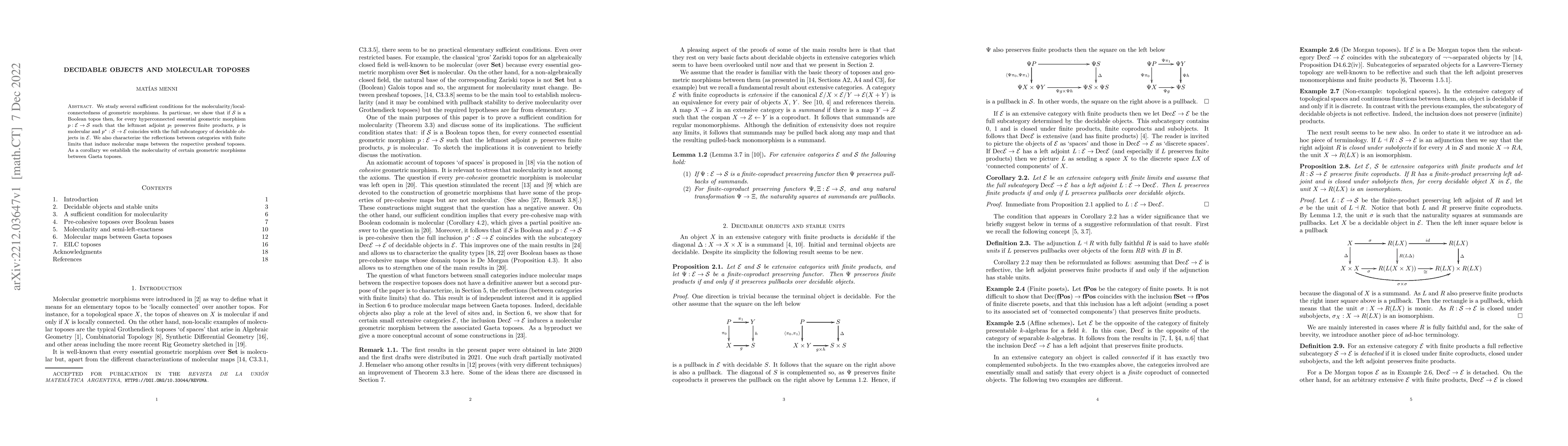 We study several sufficient conditions for the molecularity/local-connectedness of geometric morphisms. In particuar, we show that if $\mathcal{S}$ is a Boolean topos then, for every hyperconnected essential geometric morphism ${p : \mathcal{E} \rightarrow \mathcal{S}}$ such that the leftmost adjoint $p_!$ preserves finite products, $p$ is molecular and ${p^* : \mathcal{S} \rightarrow \mathcal{E}}$ coincides with the full subcategory of decidable objects in $\mathcal{E}$. We also characterize the reflections between categories with finite limits that induce molecular maps between the respective presheaf toposes. As a corollary we establish the molecularity of certain geometric morphisms between Gaeta toposes.