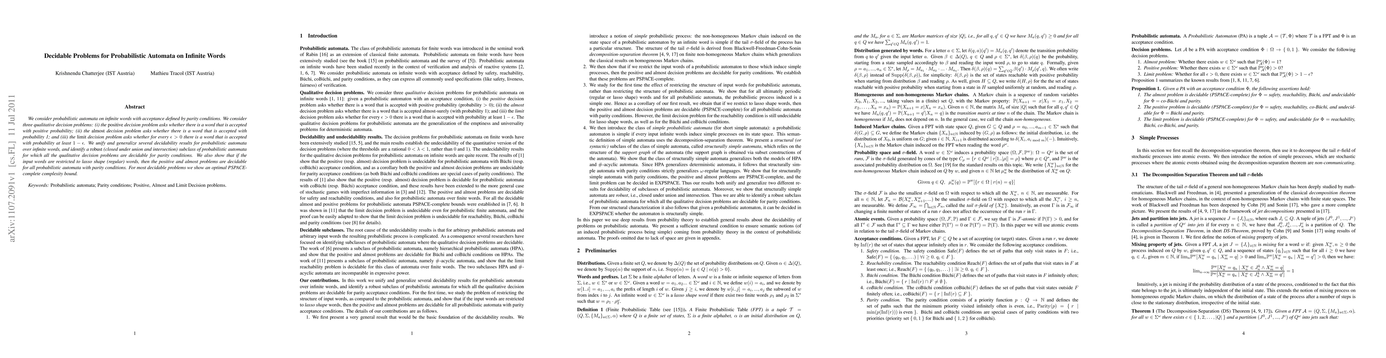 This paper explores decidability of three qualitative decision problems for probabilistic automata on infinite words with parity acceptance conditions. The authors identify a subclass where all these problems are decidable and show PSPACE-complete complexity for most decidable cases.