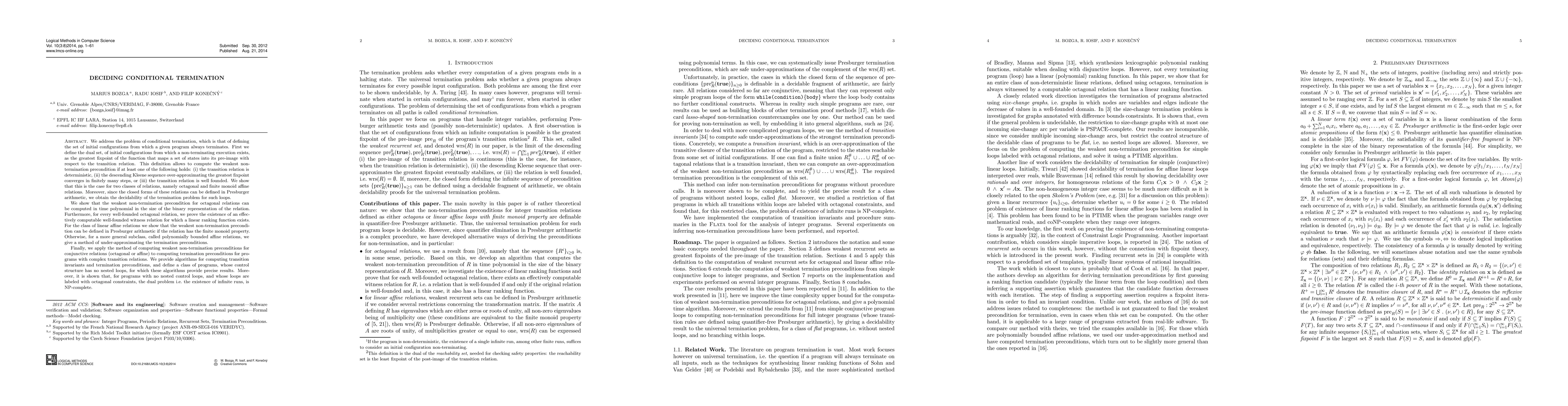 We address the problem of conditional termination, which is that of defining the set of initial configurations from which a given program always terminates. First we define the dual set, of initial configurations from which a non-terminating execution exists, as the greatest fixpoint of the function that maps a set of states into its pre-image with respect to the transition relation. This definition allows to compute the weakest non-termination precondition if at least one of the following holds: (i) the transition relation is deterministic, (ii) the descending Kleene sequence overapproximating the greatest fixpoint converges in finitely many steps, or (iii) the transition relation is well founded. We show that this is the case for two classes of relations, namely octagonal and finite monoid affine relations. Moreover, since the closed forms of these relations can be defined in Presburger arithmetic, we obtain the decidability of the termination problem for such loops.