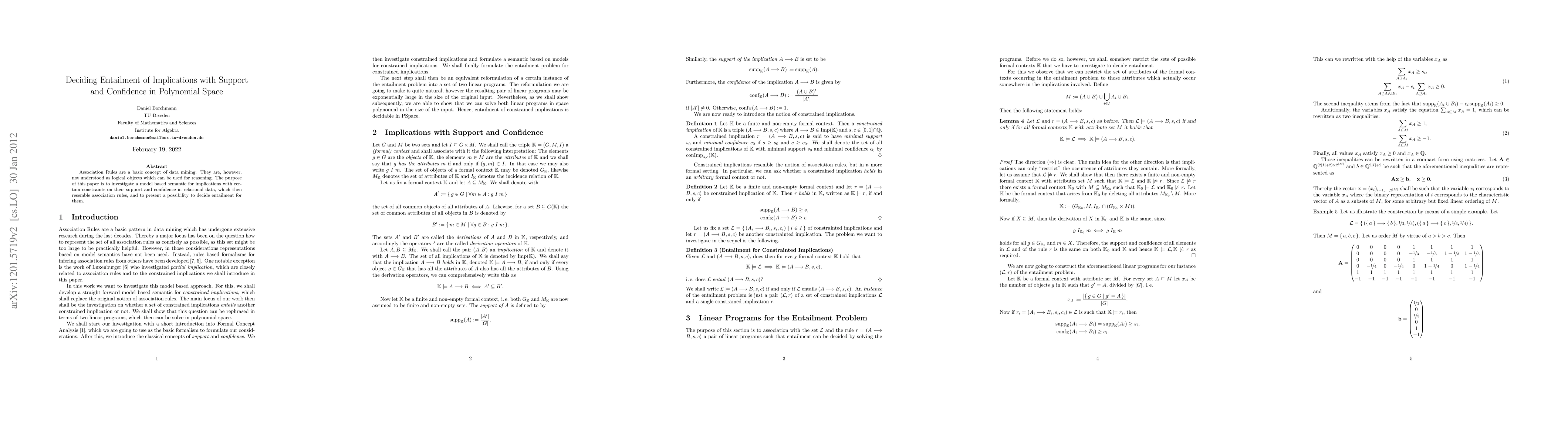 Association Rules are a basic concept of data mining. They are, however, not understood as logical objects which can be used for reasoning. The purpose of this paper is to investigate a model based semantic for implications with certain constraints on their support and confidence in relational data, which then resemble association rules, and to present a possibility to decide entailment for them.