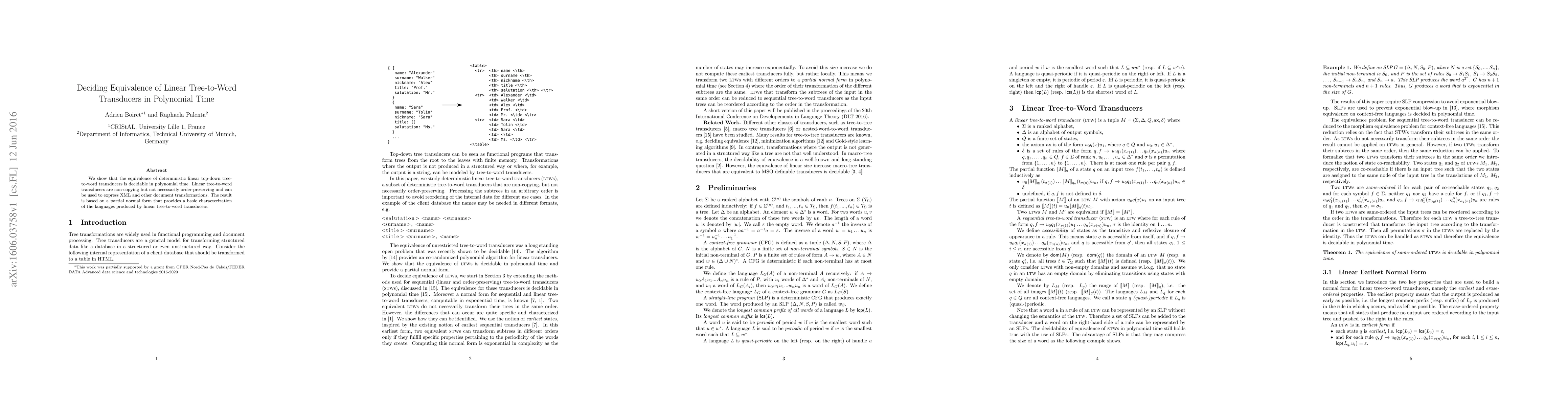 This paper demonstrates that determining the equivalence of deterministic linear top-down tree-to-word transducers can be achieved in polynomial time. It introduces a partial normal form to characterize the languages generated by these transducers, which are useful for XML and document transformations.