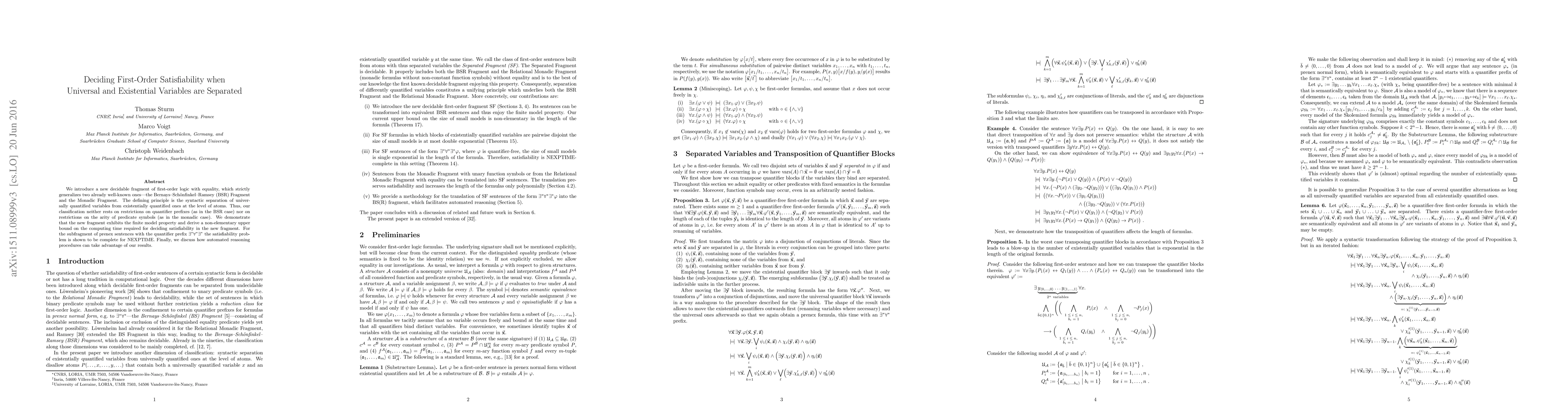 We introduce a new decidable fragment of first-order logic with equality, which strictly generalizes two already well-known ones -- the Bernays-Sch\"onfinkel-Ramsey (BSR) Fragment and the Monadic Fragment. The defining principle is the syntactic separation of universally quantified variables from existentially quantified ones at the level of atoms. Thus, our classification neither rests on restrictions on quantifier prefixes (as in the BSR case) nor on restrictions on the arity of predicate symbols (as in the monadic case). We demonstrate that the new fragment exhibits the finite model property and derive a non-elementary upper bound on the computing time required for deciding satisfiability in the new fragment. For the subfragment of prenex sentences with the quantifier prefix $\exists^* \forall^* \exists^*$ the satisfiability problem is shown to be complete for NEXPTIME. Finally, we discuss how automated reasoning procedures can take advantage of our results.