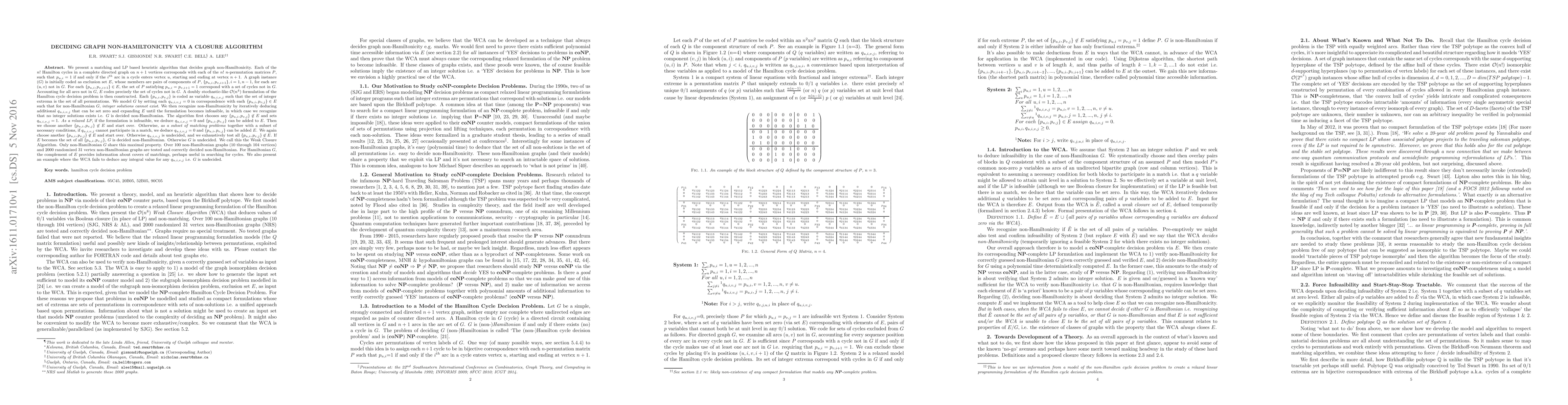 We present a matching and LP based heuristic algorithm that decides graph non-Hamiltonicity. Each of the $n!$ Hamilton cycles in a complete directed graph on $n+1$ vertices corresponds with each of the $n!$ $n$-permutation matrices $P$, such that $p_{u,i}=1$ if and only if the $i^{th}$ arc in a cycle enters vertex $u$, starting and ending at vertex $n+1$. A graph instance ($G$) is initially coded as exclusion set $E$, whose members are pairs of components of $P$, $\{p_{u,i} ,p_{v,i+1}\}, i=1,n-1$, for each arc $(u,v)$ not in $G$. For each $\{p_{u,i} ,p_{v,i+1}\}\in E$, the set of $P$ satisfying $p_{u,i}=p_{v,i+1}=1$ correspond with a set of cycles not in $G$. Accounting for all arcs not in $G$, $E$ codes precisely the set of cycles not in $G$. A doubly stochastic-like $\mathcal{O}$($n^4$) formulation of the Hamilton cycle decision problem is then constructed. Each $\{p_{u,i} ,p_{v,j}\}$ is coded as variable $q_{u,i,v,j}$ such that the set of integer extrema is the set of all permutations. We model $G$ by setting each $q_{u,i,v,j}=0$ in correspondence with each $\{p_{u,i} ,p_{v,j}\}\in E$ such that for non-Hamiltonian $G$, integer solutions cannot exist. We recognize non-Hamiltonicity by iteratively deducing additional $q_{u,i,v,j}$ that can be set zero and expanding $E$ until the formulation becomes infeasible, in which case we recognize that no integer solutions exists i.e. $G$ is decided non-Hamiltonian. Over 100 non-Hamiltonian graphs (10 through 104 vertices) and 2000 randomized 31 vertex non-Hamiltonian graphs are tested and correctly decided non-Hamiltonian. For Hamiltonian $G$, the complement of $E$ provides information about covers of matchings, perhaps useful in searching for cycles. We also present an example where the algorithm fails to deduce any integral value for any $q_{u,i,v,j}$ i.e. $G$ is undecided.