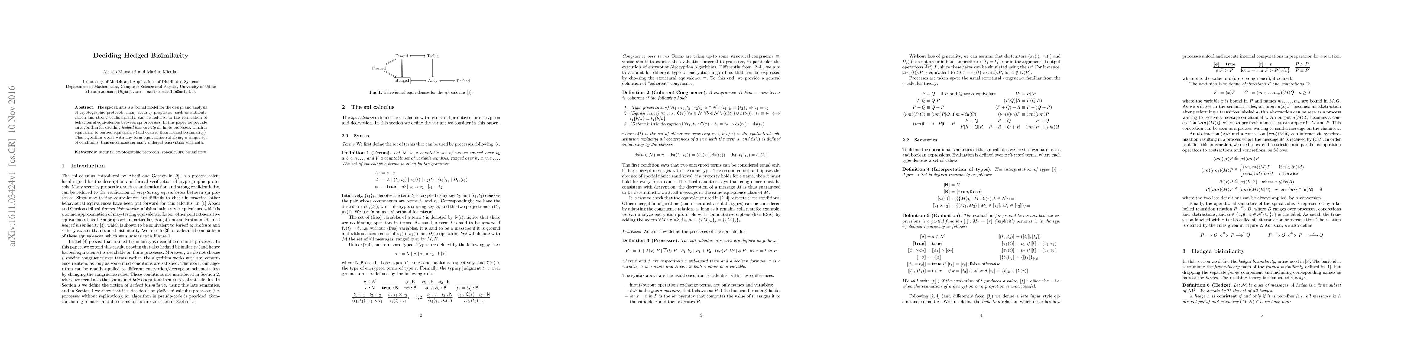 The spi-calculus is a formal model for the design and analysis of cryptographic protocols: many security properties, such as authentication and strong confidentiality, can be reduced to the verification of behavioural equivalences between spi processes. In this paper we provide an algorithm for deciding hedged bisimilarity on finite processes, which is equivalent to barbed equivalence (and coarser than framed bisimilarity). This algorithm works with any term equivalence satisfying a simple set of conditions, thus encompassing many different encryption schemata.