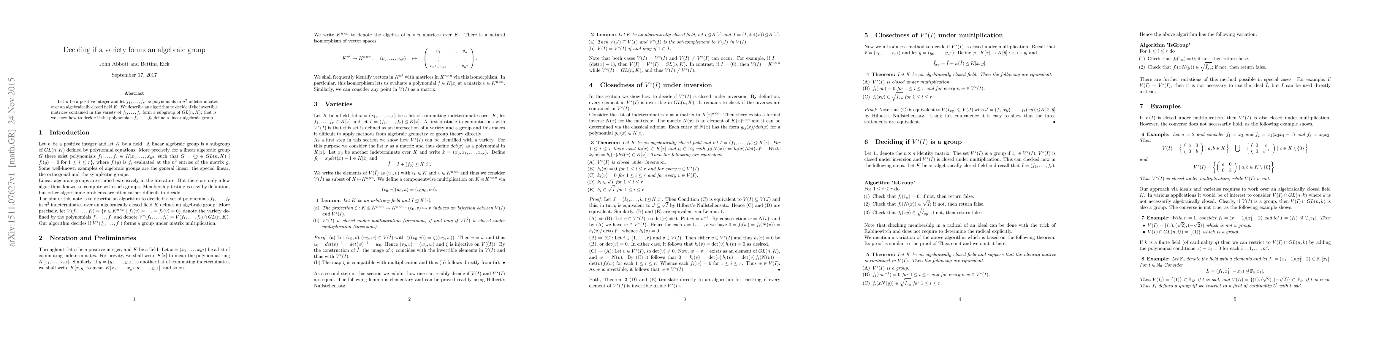Let $n$ be a positive integer and let $f_1, \ldots, f_r$ be polynomials in $n^2$ indeterminates over an algebraically closed field $K$. We describe an algorithm to decide if the invertible matrices contained in the variety of $f_1, \ldots, f_r$ form a subgroup of $GL(n,K)$; that is, we show how to decide if the polynomials $f_1, \ldots, f_r$ define a linear algebraic group.
