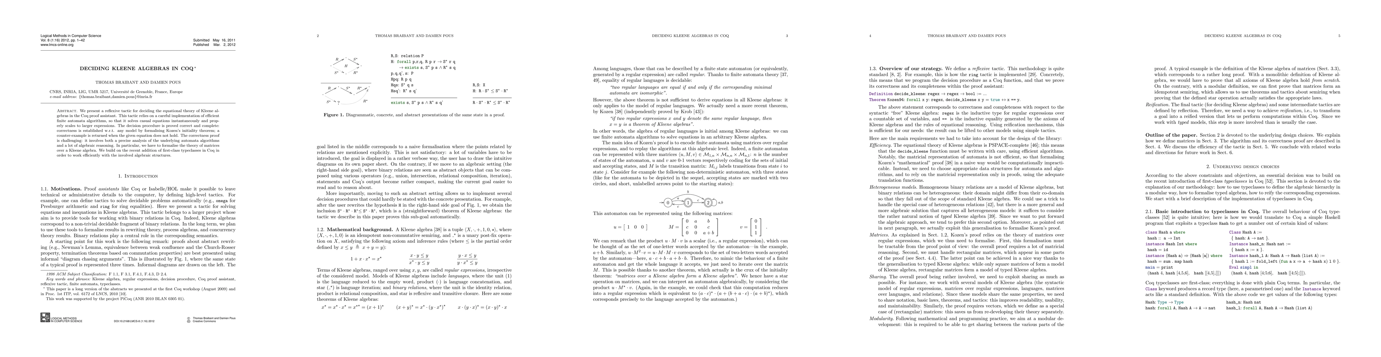 This paper introduces a reflexive tactic in Coq for deciding the equational theory of Kleene algebras, leveraging efficient finite automata algorithms. The tactic is proven correct and complete, returning counter-examples for invalid equations, with correctness established via formalization of Kozen's initiality theorem.
