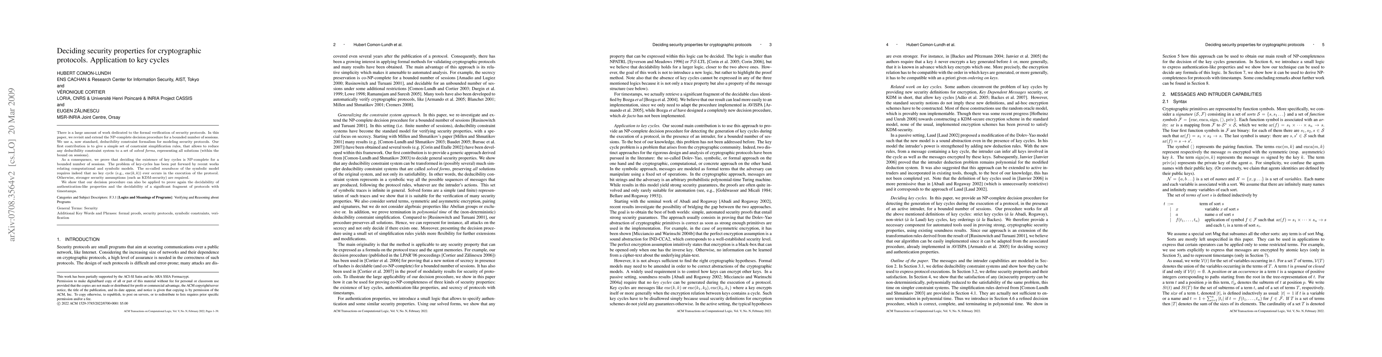A new method for simplifying complex security protocols was developed, enabling the solution of key cycles in a bounded number of sessions, proving its NP-completeness and applying it to authentication-like properties and timed protocols.