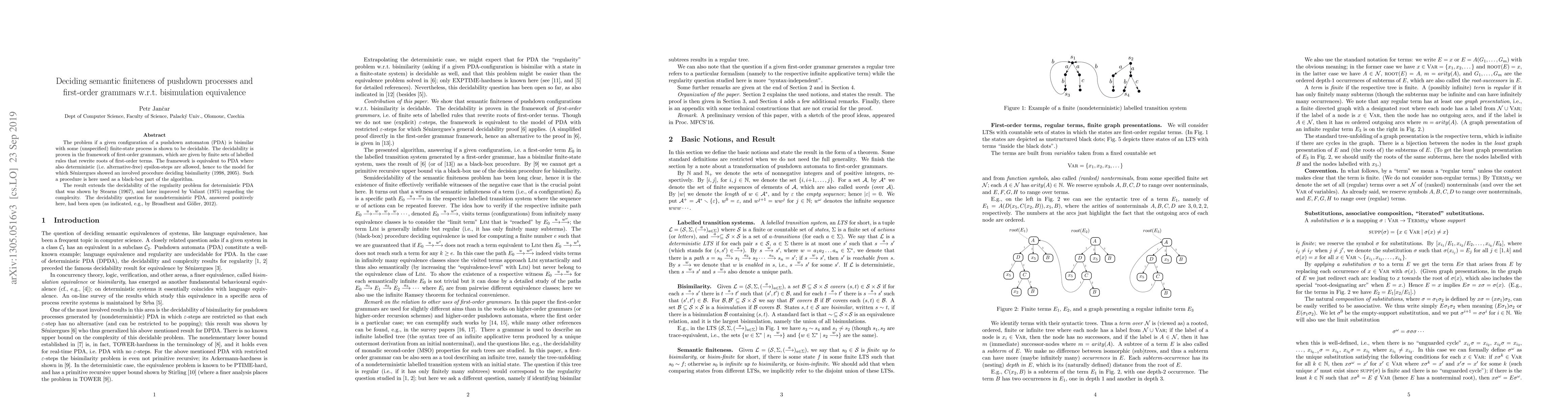 The problem if a given configuration of a pushdown automaton (PDA) is bisimilar with some (unspecified) finite-state process is shown to be decidable. The decidability is proven in the framework of first-order grammars, which are given by finite sets of labelled rules that rewrite roots of first-order terms. The framework is equivalent to PDA where also deterministic (i.e. alternative-free) epsilon-steps are allowed, i.e. to the model for which S\'enizergues showed an involved procedure deciding bisimilarity (1998, 2005). Such a procedure is here used as a black-box part of the algorithm. The result extends the decidability of the regularity problem for deterministic PDA that was shown by Stearns (1967), and later improved by Valiant (1975) regarding the complexity. The decidability question for nondeterministic PDA, answered positively here, had been open (as indicated, e.g., by Broadbent and G\"oller, 2012).