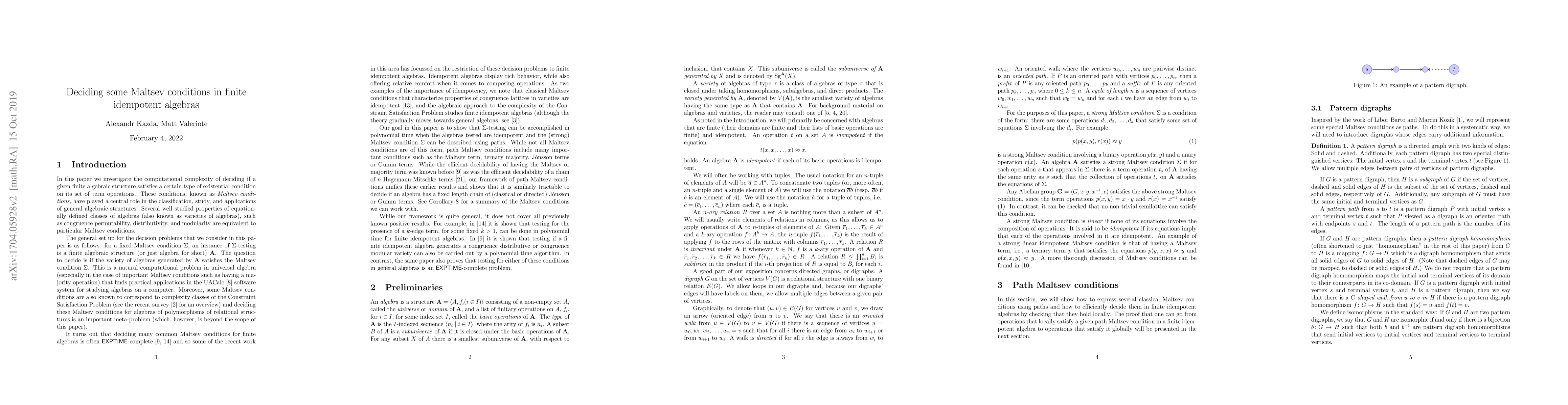 In this paper we investigate the computational complexity of deciding if a given finite algebraic structure satisfies a fixed (strong) Maltsev condition $\Sigma$. Our goal in this paper is to show that $\Sigma$-testing can be accomplished in polynomial time when the algebras tested are idempotent and the Maltsev condition $\Sigma$ can be described using paths. Examples of such path conditions are having a Maltsev term, having a majority operation, and having a chain of J\'onsson (or Gumm) terms of fixed length.