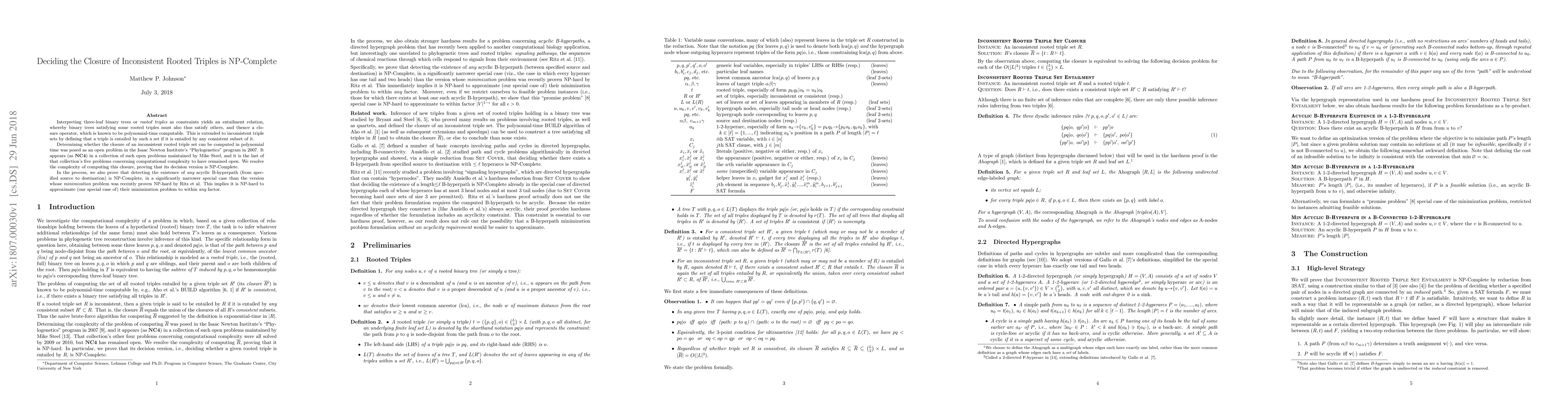 This paper proves that determining the closure of inconsistent rooted triples is NP-Complete, resolving an open problem from the 2007 "Phylogenetics" program. Additionally, it establishes the NP-Completeness of detecting any acyclic B-hyperpath in a narrower special case.