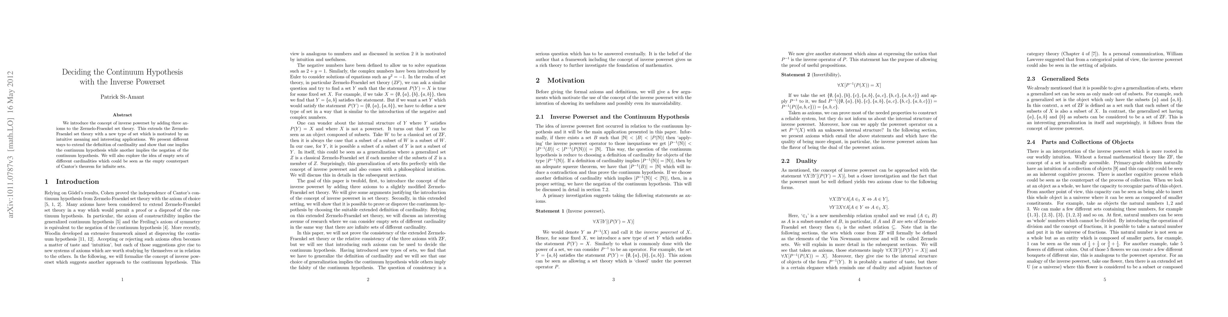 This paper proposes extending Zermelo-Fraenkel set theory with the concept of inverse powerset through three new axioms, introducing a novel type of set. It explores different extensions of cardinality, revealing one that supports the continuum hypothesis and another that refutes it.