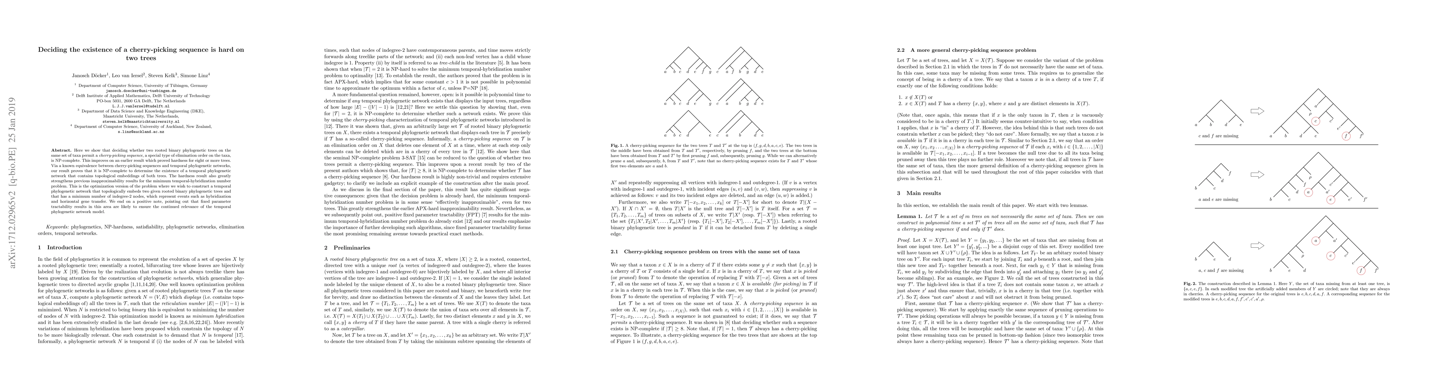 Here we show that deciding whether two rooted binary phylogenetic trees on the same set of taxa permit a cherry-picking sequence, a special type of elimination order on the taxa, is NP-complete. This improves on an earlier result which proved hardness for eight or more trees. Via a known equivalence between cherry-picking sequences and temporal phylogenetic networks, our result proves that it is NP-complete to determine the existence of a temporal phylogenetic network that contains topological embeddings of both trees. The hardness result also greatly strengthens previous inapproximability results for the minimum temporal-hybridization number problem. This is the optimization version of the problem where we wish to construct a temporal phylogenetic network that topologically embeds two given rooted binary phylogenetic trees and that has a minimum number of indegree-2 nodes, which represent events such as hybridization and horizontal gene transfer. We end on a positive note, pointing out that fixed parameter tractability results in this area are likely to ensure the continued relevance of the temporal phylogenetic network model.