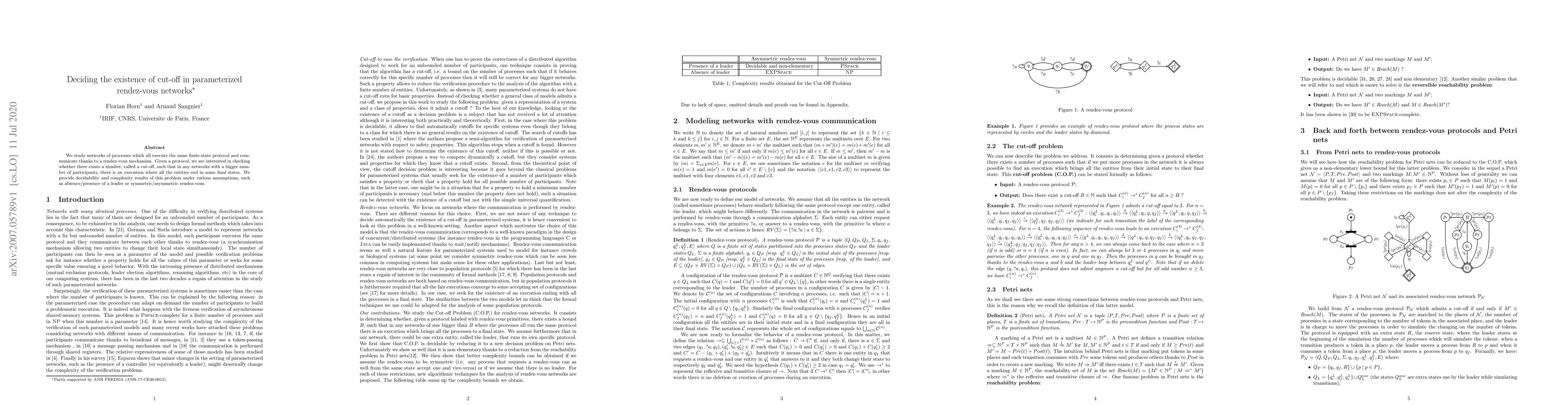 We study networks of processes which all execute the same finite-state protocol and communicate thanks to a rendez-vous mechanism. Given a protocol, we are interested in checking whether there exists a number, called a cut-off, such that in any networks with a bigger number of participants, there is an execution where all the entities end in some final states. We provide decidability and complexity results of this problem under various assumptions, such as absence/presence of a leader or symmetric/asymmetric rendez-vous.