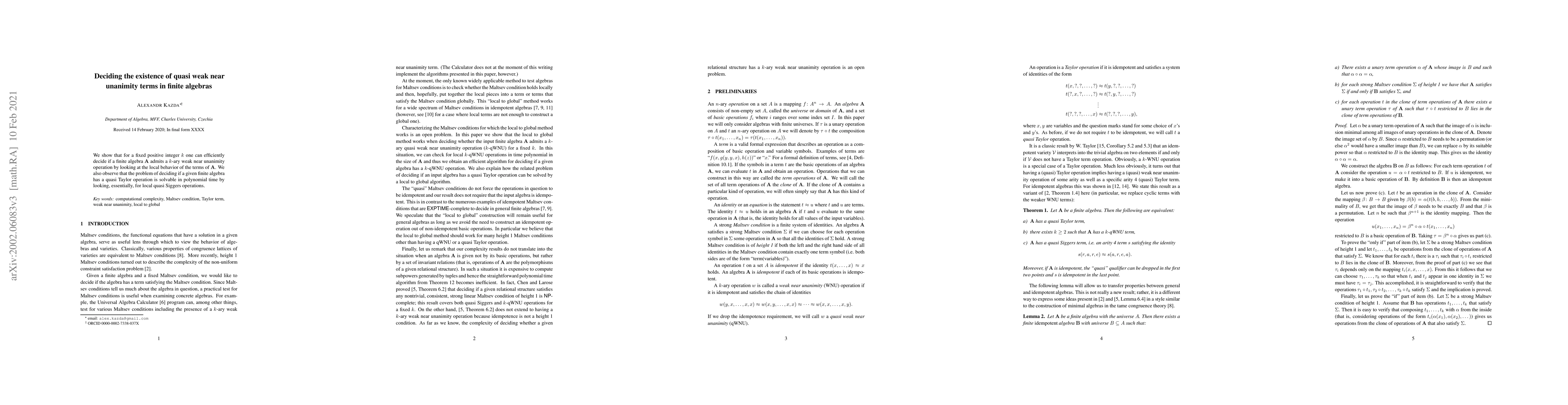 Summary: This paper presents an efficient method to determine if a finite algebra has a k-ary weak near unanimity operation by examining local term behavior. Additionally, it shows that deciding the existence of quasi Taylor operations in finite algebras is solvable in polynomial time through the identification of local quasi Siggers operations.