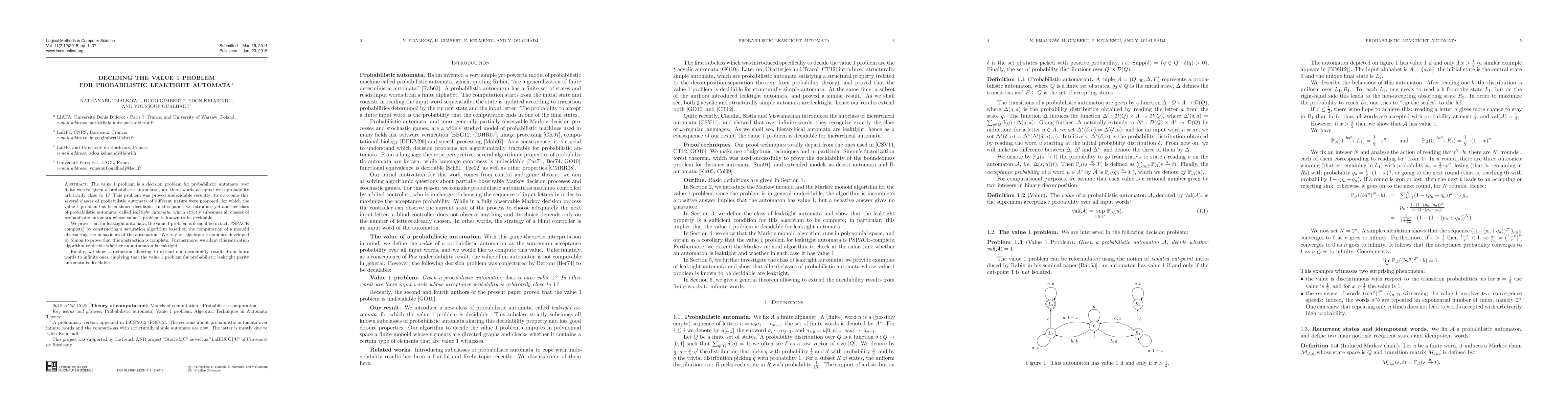 The introduction of leaktight automata and the PSPACE-complete decidability of the value 1 problem for these automata, along with the construction of a saturation algorithm based on a stabilization monoid.