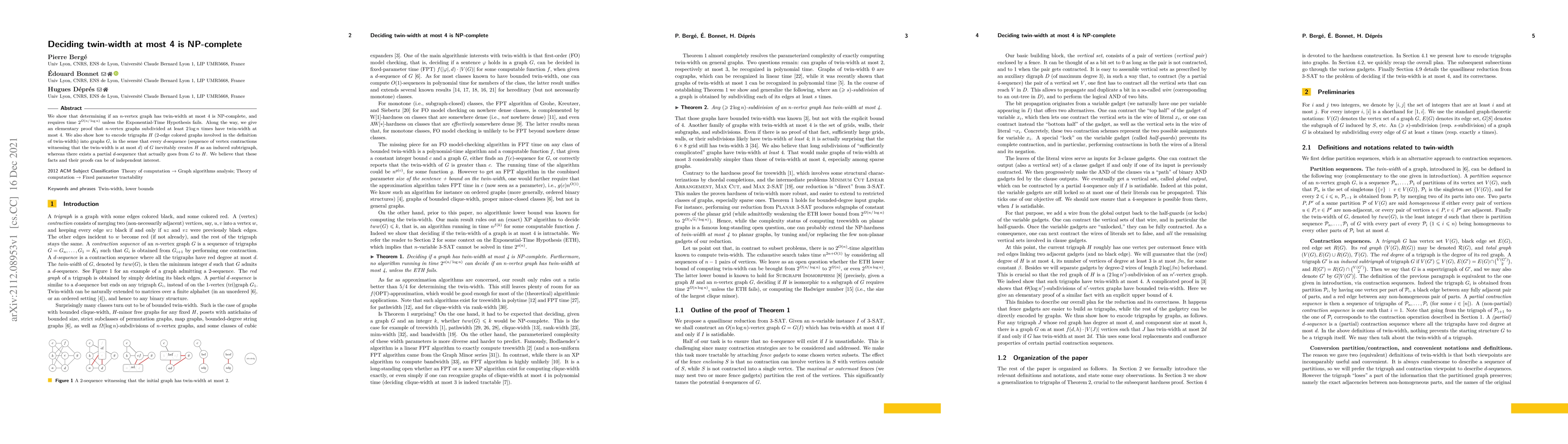 This research demonstrates that determining if an $n$-vertex graph has twin-width at most 4 is NP-complete and requires significant computational time. Additionally, it provides elementary proofs for related graph properties and introduces encoding techniques for trigraphs into graphs.