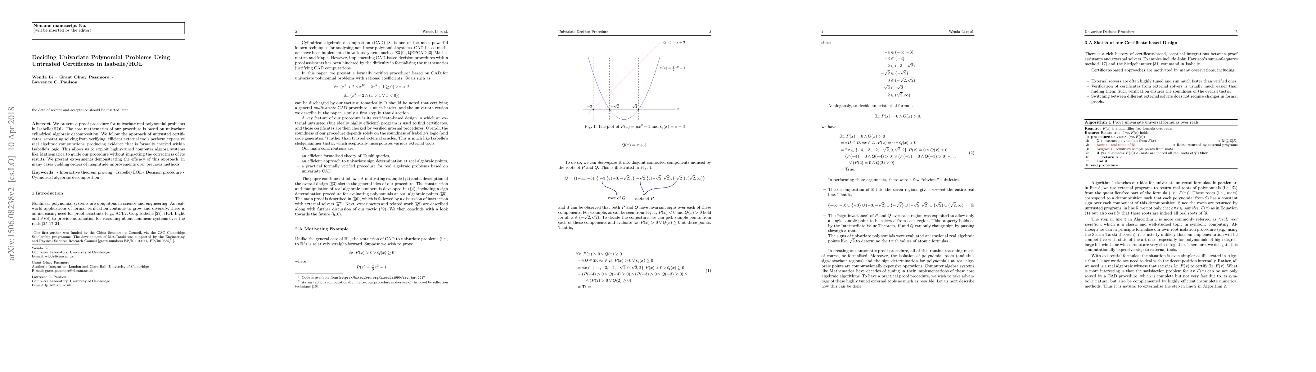 Researchers in Isabelle/HOL develop a proof procedure for univariate real polynomial problems using untrusted certificates, significantly improving solving times with external computer algebra systems.