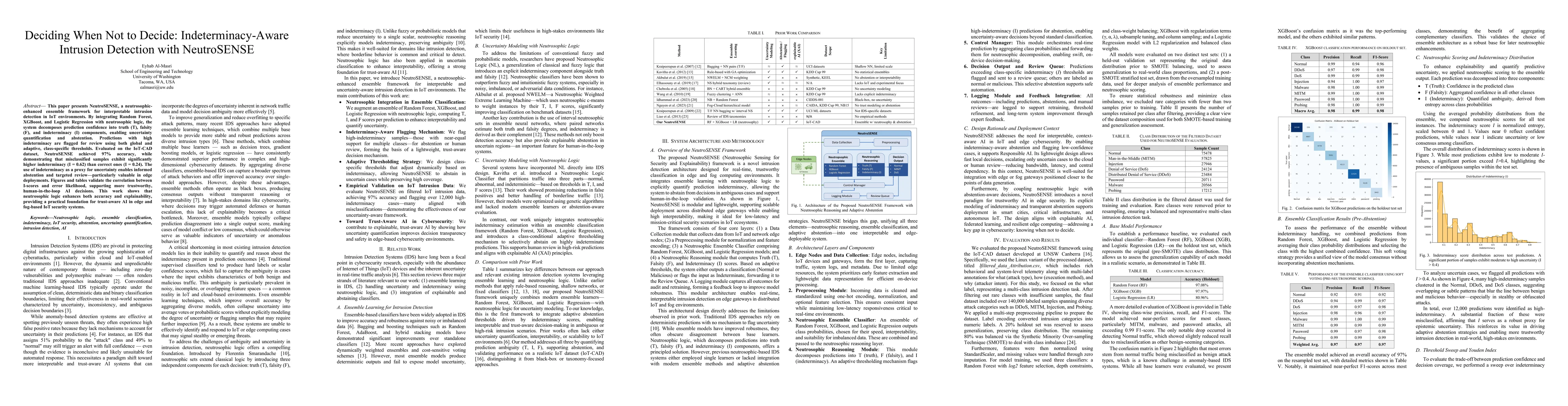 This paper presents NeutroSENSE, a neutrosophic-enhanced ensemble framework for interpretable intrusion detection in IoT environments. By integrating Random Forest, XGBoost, and Logistic Regression with neutrosophic logic, the system decomposes prediction confidence into truth (T), falsity (F), and indeterminacy (I) components, enabling uncertainty quantification and abstention. Predictions with high indeterminacy are flagged for review using both global and adaptive, class-specific thresholds. Evaluated on the IoT-CAD dataset, NeutroSENSE achieved 97% accuracy, while demonstrating that misclassified samples exhibit significantly higher indeterminacy (I = 0.62) than correct ones (I = 0.24). The use of indeterminacy as a proxy for uncertainty enables informed abstention and targeted review-particularly valuable in edge deployments. Figures and tables validate the correlation between I-scores and error likelihood, supporting more trustworthy, human-in-the-loop AI decisions. This work shows that neutrosophic logic enhances both accuracy and explainability, providing a practical foundation for trust-aware AI in edge and fog-based IoT security systems.
