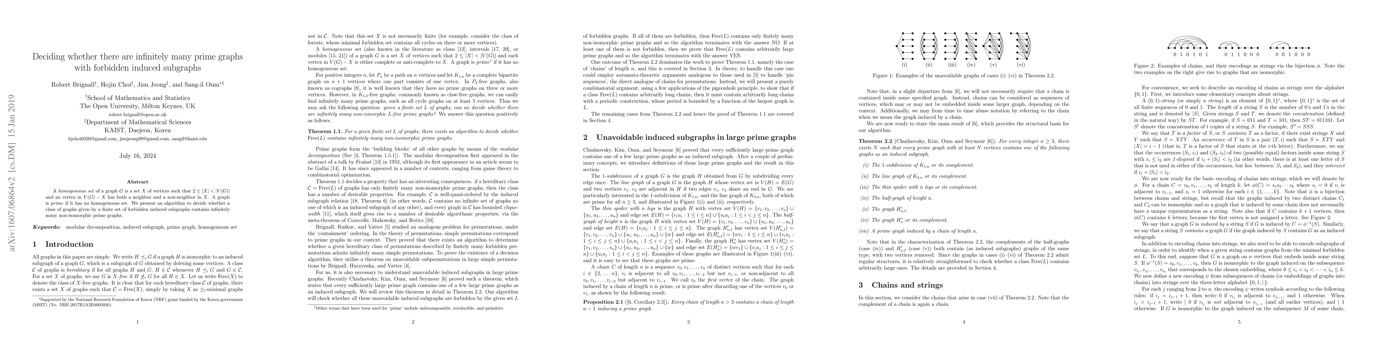 Summary: This paper presents an algorithm to determine if a class of graphs defined by a finite set of forbidden induced subgraphs contains infinitely many non-isomorphic prime graphs, where a prime graph has no homogeneous set.