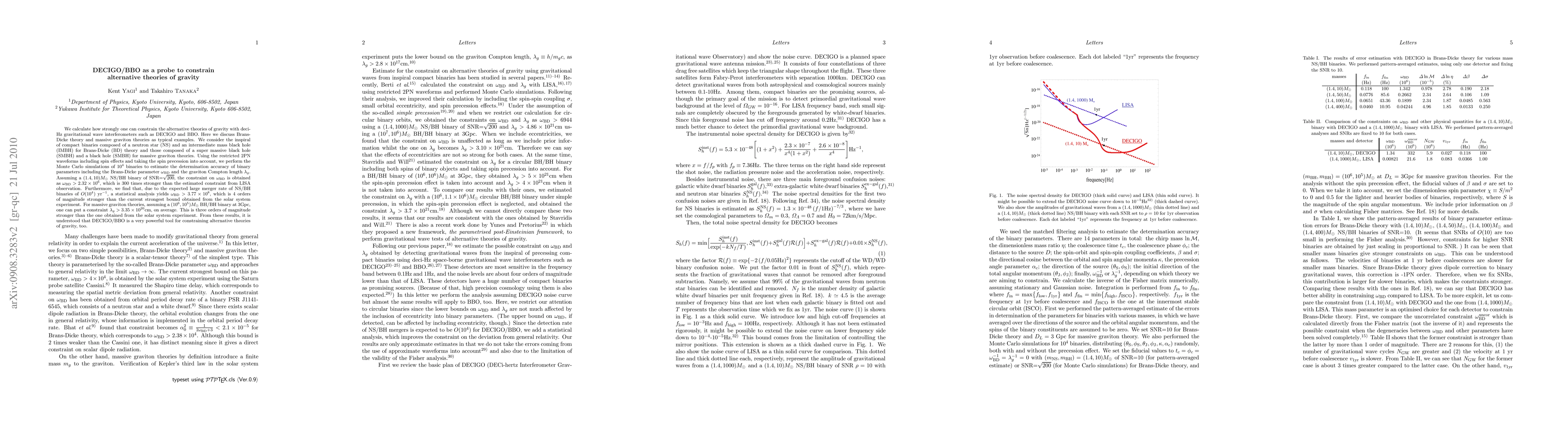 This paper evaluates the capability of deci-Hz gravitational wave interferometers like DECIGO and BBO to constrain alternative gravity theories, specifically Brans-Dicke and massive graviton theories. The results show that DECIGO/BBO can significantly improve the constraints on these theories, providing orders of magnitude stronger bounds than current solar system experiments.