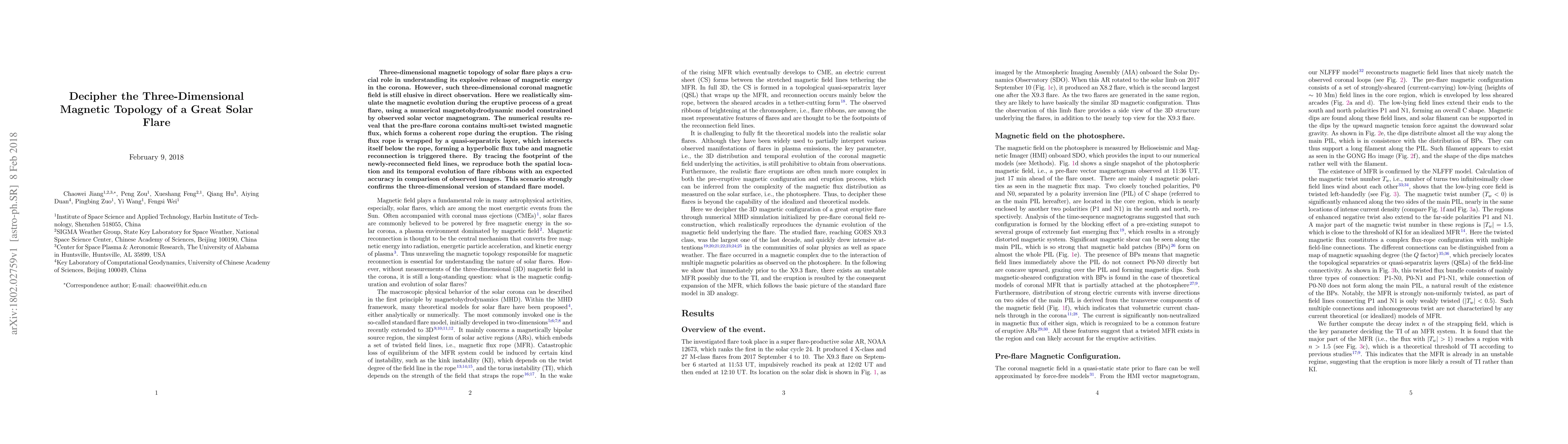 This paper simulates the three-dimensional magnetic topology during a great solar flare, revealing a pre-flare corona with twisted magnetic flux forming a rising flux rope wrapped in a quasi-separatrix layer. The model accurately reproduces the flare ribbons' spatial and temporal evolution, confirming the three-dimensional standard flare model.