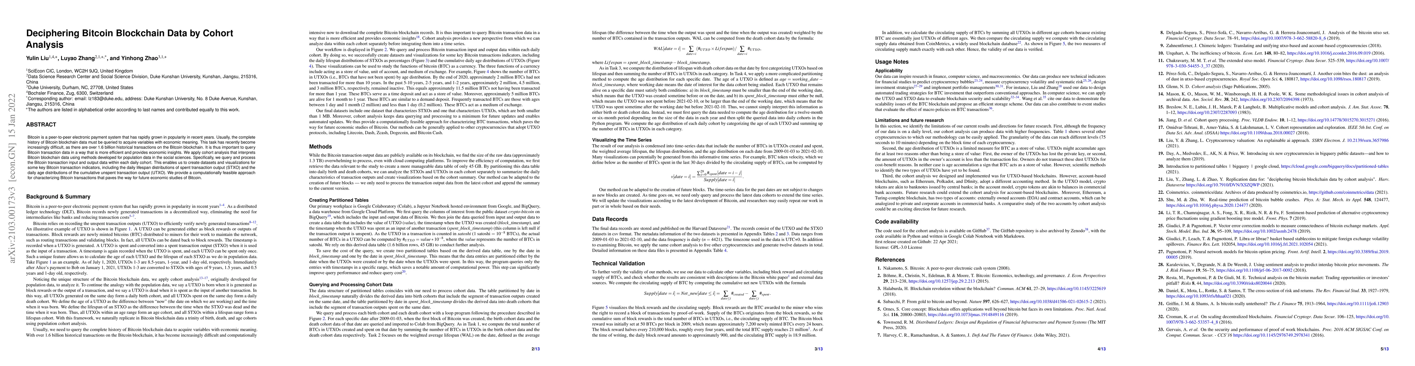 This paper applies cohort analysis to efficiently interpret Bitcoin blockchain data, focusing on daily cohorts of transaction inputs and outputs to create datasets and visualizations for key indicators like STXO and UTXO distributions. This method offers a feasible approach for future economic studies of Bitcoin.