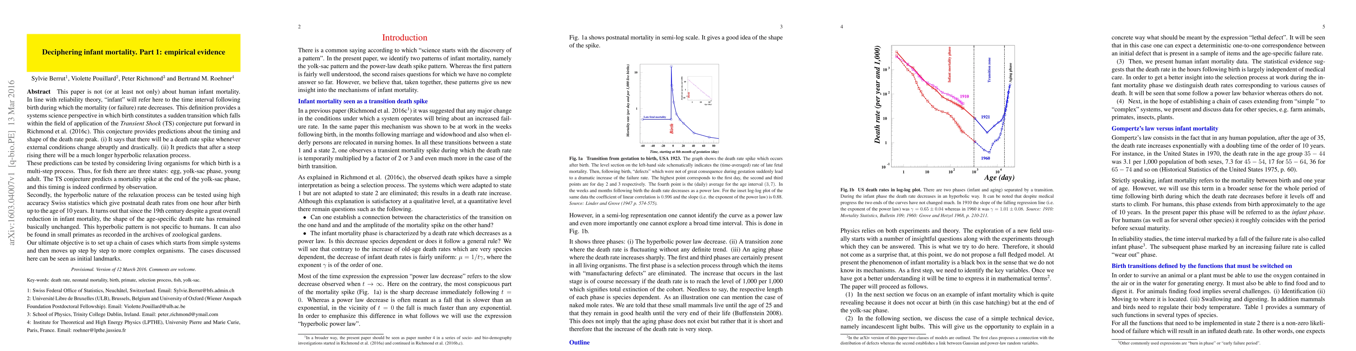 This paper is not (or at least not only) about human infant mortality. In line with reliability theory, "infant" will refer here to the time interval following birth during which the mortality (or failure) rate decreases. This definition provides a systems science perspective in which birth constitutes a sudden transition which falls within the field of application of the "Transient Shock" (TS) conjecture put forward in Richmond et al. (2016c). This conjecture provides predictions about the timing and shape of the death rate peak. (i) It says that there will be a death rate spike whenever external conditions change abruptly and drastically. (ii) It predicts that after a steep rising there will be a much longer hyperbolic relaxation process. These predictions can be tested by considering living organisms for which birth is a multi-step process. Thus, for fish there are three states: egg, yolk-sac phase, young adult. The TS conjecture predicts a mortality spike at the end of the yolk-sac phase, and this timing is indeed confirmed by observation. Secondly, the hyperbolic nature of the relaxation process can be tested using high accuracy Swiss statistics which give postnatal death rates from one hour after birth up to the age of 10 years. It turns out that since the 19th century despite a great overall reduction in infant mortality, the shape of the age-specific death rate has remained basically unchanged. This hyperbolic pattern is not specific to humans. It can also be found in small primates as recorded in the archives of zoological gardens. Our ultimate objective is to set up a chain of cases which starts from simple systems and then moves up step by step to more complex organisms. The cases discussed here can be seen as initial landmarks.