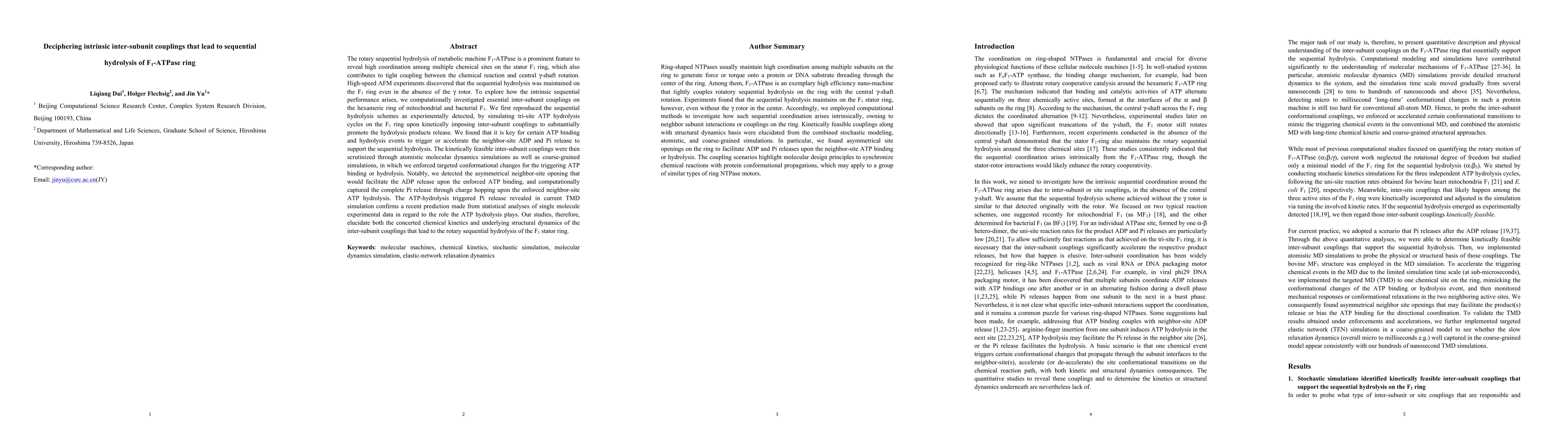 The rotary sequential hydrolysis of metabolic machine F1-ATPase is a prominent feature to reveal high coordination among multiple chemical sites on the stator F1 ring, which also contributes to tight coupling between the chemical reaction and central {\gamma}-shaft rotation. High-speed AFM experiments discovered that the sequential hydrolysis was maintained on the F1 ring even in the absence of the {\gamma} rotor. To explore how the intrinsic sequential performance arises, we computationally investigated essential inter-subunit couplings on the hexameric ring of mitochondrial and bacterial F1. We first reproduced the sequential hydrolysis schemes as experimentally detected, by simulating tri-site ATP hydrolysis cycles on the F1 ring upon kinetically imposing inter-subunit couplings to substantially promote the hydrolysis products release. We found that it is key for certain ATP binding and hydrolysis events to facilitate the neighbor-site ADP and Pi release to support the sequential hydrolysis. The kinetically feasible couplings were then scrutinized through atomistic molecular dynamics simulations as well as coarse-grained simulations, in which we enforced targeted conformational changes for the ATP binding or hydrolysis. Notably, we detected the asymmetrical neighbor-site opening that would facilitate the ADP release upon the enforced ATP binding, and computationally captured the complete Pi release through charge hopping upon the enforced neighbor-site ATP hydrolysis. The ATP-hydrolysis triggered Pi release revealed in current TMD simulation confirms a recent prediction made from statistical analyses of single molecule experimental data in regard to the role ATP hydrolysis plays. Our studies, therefore, elucidate both the concerted chemical kinetics and underlying structural dynamics of the inter-subunit couplings that lead to the rotary sequential hydrolysis of the F1 ring.