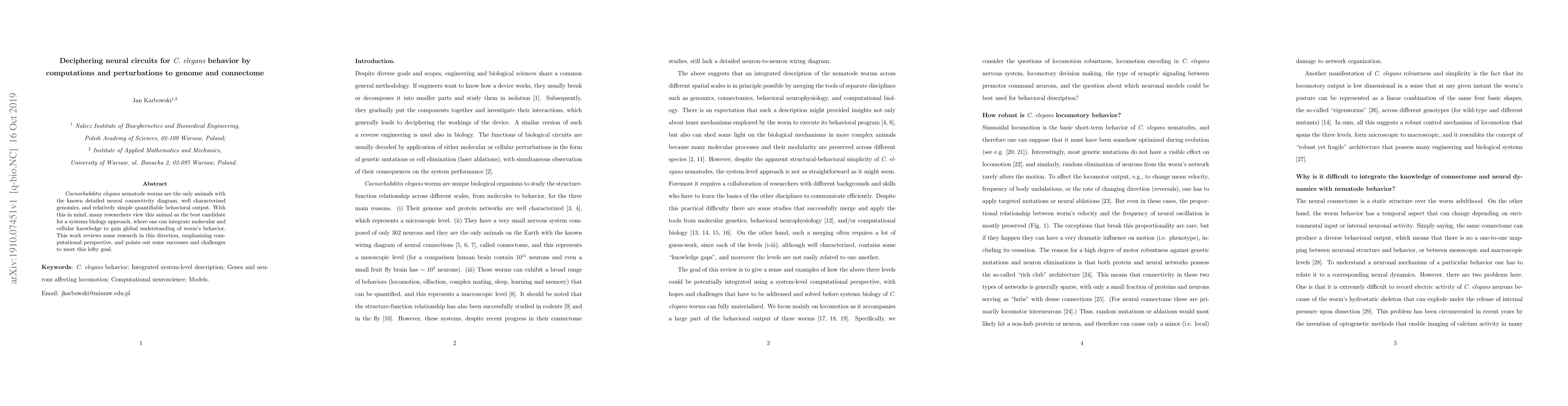 This paper reviews efforts to understand the behavior of {\it Caenorhabditis elegans} through integrating its detailed neural connectivity and genomics, highlighting computational approaches and successes, while also noting remaining challenges in achieving a comprehensive systems biology understanding.