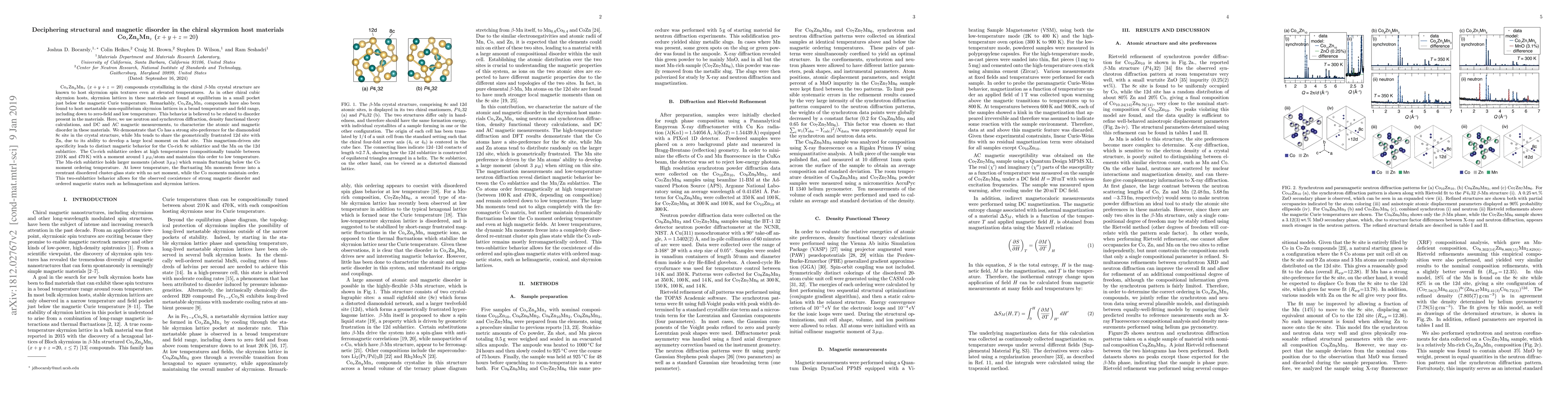 Co$_x$Zn$_y$Mn$_z$ ($x+y+z=20$) compounds crystallizing in the chiral $\beta$-Mn crystal structure are known to host skyrmion spin textures even at elevated temperatures. As in other chiral cubic skyrmion hosts, skyrmion lattices in these materials are found at equilibrium in a small pocket just below the magnetic Curie temperature. Remarkably, CoxZnyMnz compounds have also been found to host metastable non-equilibrium skyrmion lattices in a broad temperature and field range, including down to zero-field and low temperature. This behavior is believed to be related to disorder present in the materials. Here, we use neutron and synchrotron diffraction, density functional theory calculations, and DC and AC magnetic measurements, to characterize the atomic and magnetic disorder in these materials. We demonstrate that Co has a strong site-preference for the diamondoid 8c site in the crystal structure, while Mn tends to share the geometrically frustrated 12d site with Zn, due to its ability to develop a large local moment on that site. This magnetism-driven site specificity leads to distinct magnetic behavior for the Co-rich 8c sublattice and the Mn on the 12d sublattice. The Co-rich sublattice orders at high temperatures (compositionally tunable between 100K to 470K) with a moment around 1 $\mu_B$/atom and maintains this order to low temperature. The Mn-rich sublattice holds larger moments (about 3 $\mu_B$ which remain fluctuating below the Co moment ordering temperature. At lower temperature, the fluctuating Mn moments freeze into a reentrant disordered cluster-glass state with no net moment, while the Co moments maintain order. This two-sublattice behavior allows for the observed coexistence of strong magnetic disorder and ordered magnetic states such as helimagnetism and skyrmion lattices.