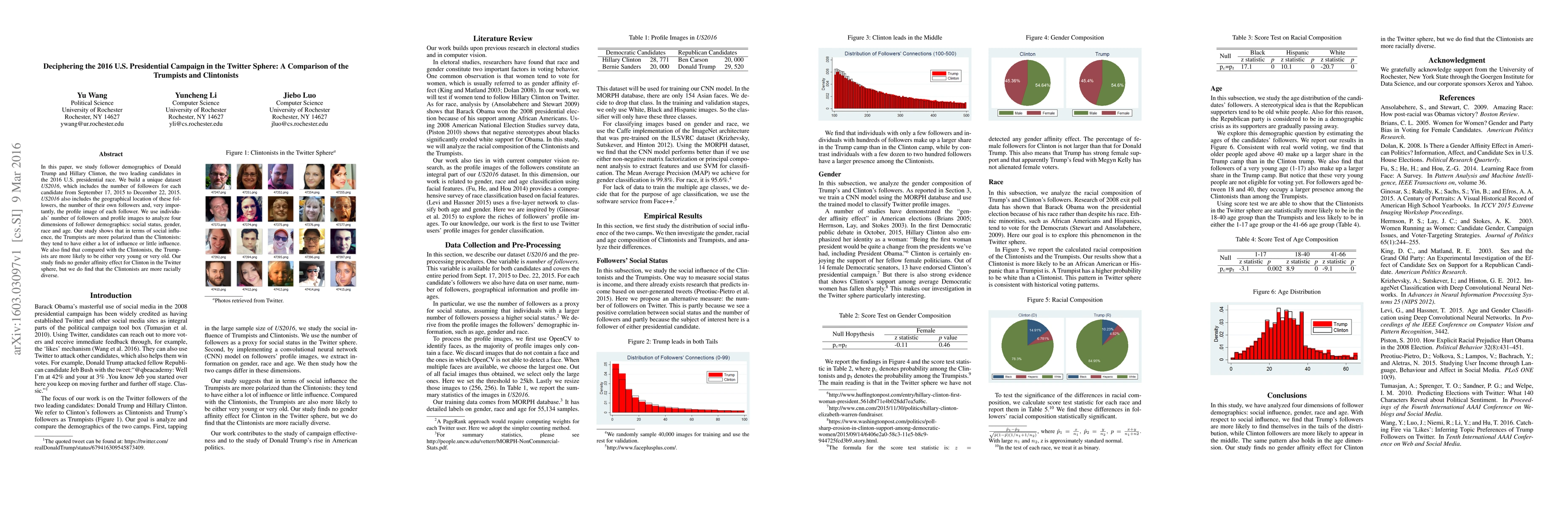 In this paper, we study follower demographics of Donald Trump and Hillary Clinton, the two leading candidates in the 2016 U.S. presidential race. We build a unique dataset US2016, which includes the number of followers for each candidate from September 17, 2015 to December 22, 2015. US2016 also includes the geographical location of these followers, the number of their own followers and, very importantly, the profile image of each follower. We use individuals' number of followers and profile images to analyze four dimensions of follower demographics: social status, gender, race and age. Our study shows that in terms of social influence, the Trumpists are more polarized than the Clintonists: they tend to have either a lot of influence or little influence. We also find that compared with the Clintonists, the Trumpists are more likely to be either very young or very old. Our study finds no gender affinity effect for Clinton in the Twitter sphere, but we do find that the Clintonists are more racially diverse.