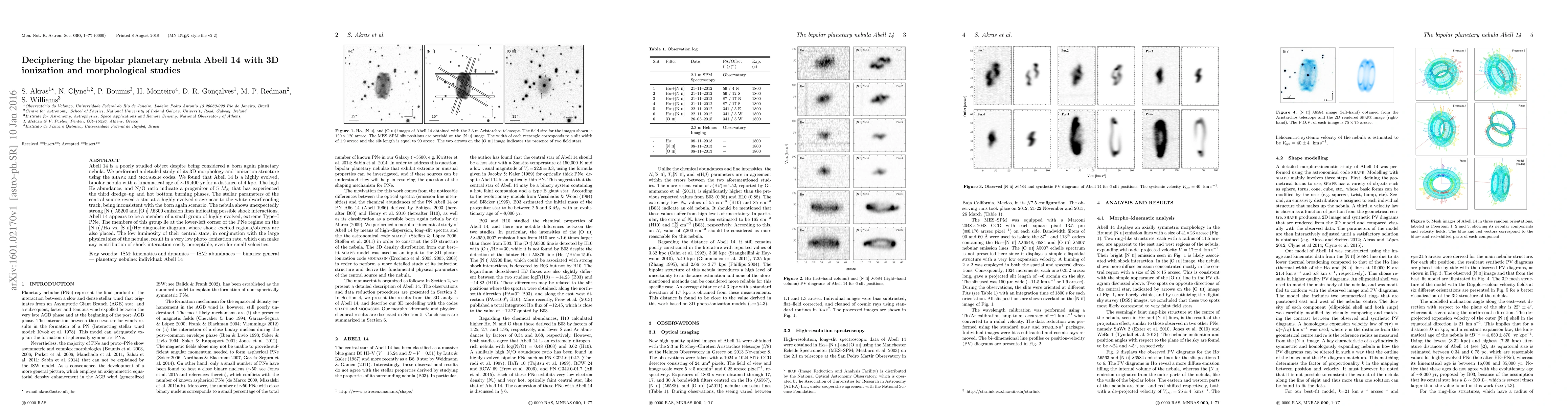 Abell 14 is a poorly studied object despite being considered a born again planetary nebula. We performed a detailed study of its 3D morphology and ionization structure using the SHAPE and MOCASSIN codes. We found that Abell 14 is a highly evolved, bipolar nebula with a kinematical age of $\sim$19,400 yr for a distance of 4 kpc. The high He abundance, and N/O ratio indicate a progenitor of 5 $M_{\odot}$ that has experienced the third dredge-up and hot bottom burning phases. The stellar parameters of the central source reveal a star at a highly evolved stage near to the white dwarf cooling track, being inconsistent with the born again scenario. The nebula shows unexpectedly strong [N I] $\lambda 5200$ and [O I] $\lambda 6300$ emission lines indicating possible shock interactions. Abell 14 appears to be a member of a small group of highly evolved, extreme Type-I PNe. The members of this group lie at the lower-left corner of the PNe regime on the [N II]/H$\alpha$ vs. [S II]/H$\alpha$ diagnostic diagram, where shock--excited regions/objects are also placed. The low luminosity of their central stars, in conjunction with the large physical size of the nebulae, result in a very low photo-ionization rate, which can make any contribution of shock interaction easily perceptible, even for small velocities.
