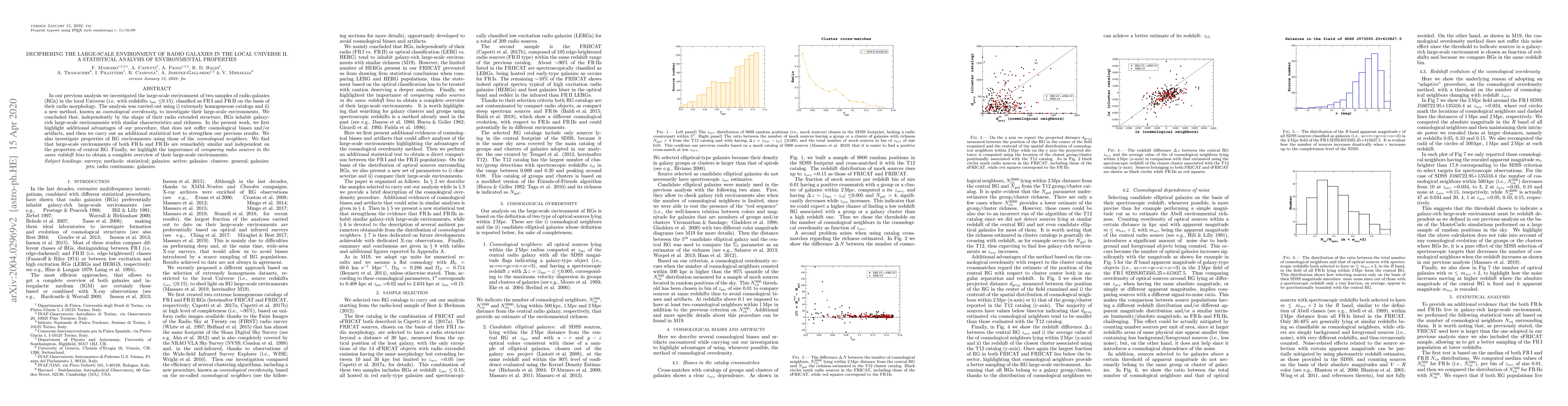 In our previous analysis we investigated the large-scale environment of two samples of radio galaxies (RGs) in the local Universe (i.e. with redshifts z<0.15), classified as FR I and FR II on the basis of their radio morphology. The analysis was carried out using i) extremely homogeneous catalogs and ii) a new method, known as cosmological overdensity, to investigate their large-scale environments. We concluded that, independently by the shape of their radio extended structure, RGs inhabit galaxy-rich large-scale environments with similar characteristics and richness. In the present work, we first highlight additional advantages of our procedure, that does not suffer cosmological biases and/or artifacts, and then we carry out an additional statistical test to strengthen our previous results. We also investigate properties of RG environments using those of the cosmological neighbors. We find that large-scale environments of both FRIs and FRIIs are remarkably similar and independent on the properties of central RG. Finally, we highlight the importance of comparing radio sources in the same redshift bins to obtain a complete overview of their large-scale environments.