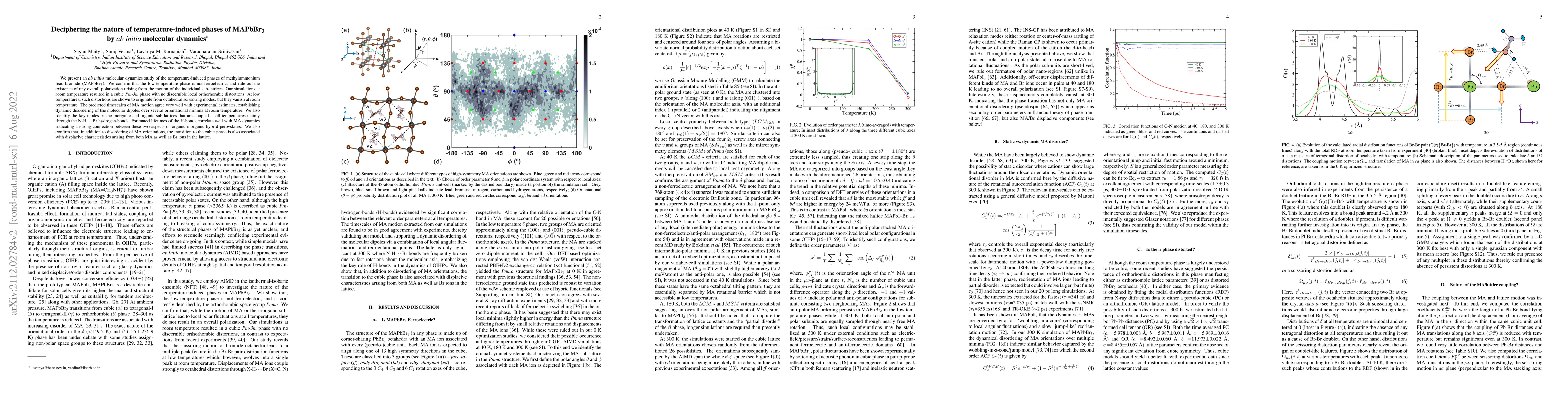 This study uses \textit{ab initio} molecular dynamics to investigate the temperature-induced phases of MAPbBr$_3$, confirming the absence of ferroelectricity and overall polarization. At room temperature, simulations reveal a cubic phase without local orthorhombic distortions, while low-temperature phases exhibit octahedral distortions that vanish at higher temperatures.