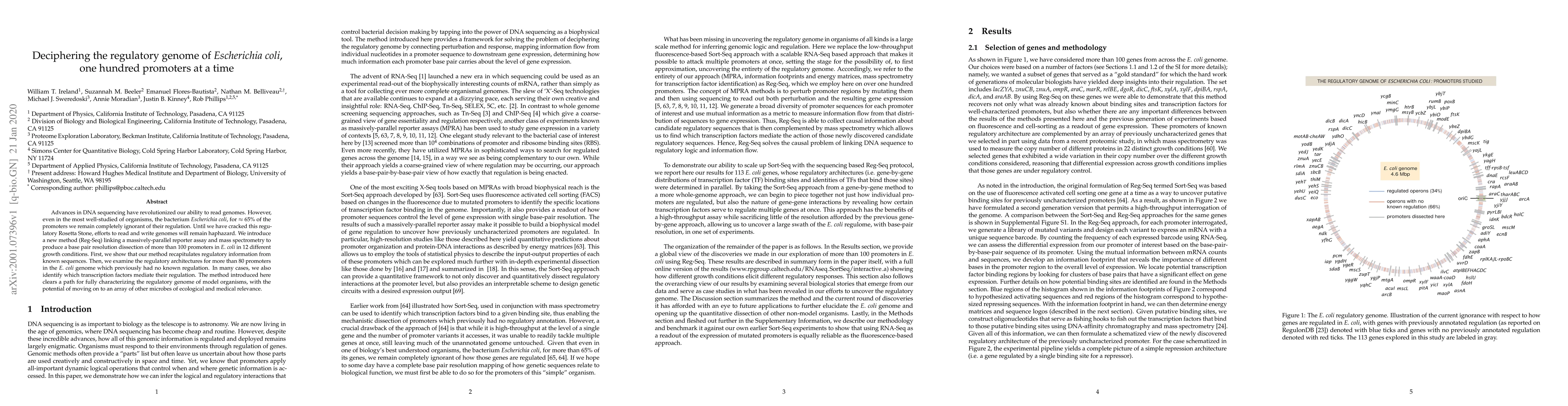 Advances in DNA sequencing have revolutionized our ability to read genomes. However, even in the most well-studied of organisms, the bacterium ${\it Escherichia coli}$, for $\approx$ 65$\%$ of the promoters we remain completely ignorant of their regulation. Until we have cracked this regulatory Rosetta Stone, efforts to read and write genomes will remain haphazard. We introduce a new method (Reg-Seq) linking a massively-parallel reporter assay and mass spectrometry to produce a base pair resolution dissection of more than 100 promoters in ${\it E. coli}$ in 12 different growth conditions. First, we show that our method recapitulates regulatory information from known sequences. Then, we examine the regulatory architectures for more than 80 promoters in the ${\it E. coli}$ genome which previously had no known regulation. In many cases, we also identify which transcription factors mediate their regulation. The method introduced here clears a path for fully characterizing the regulatory genome of model organisms, with the potential of moving on to an array of other microbes of ecological and medical relevance.