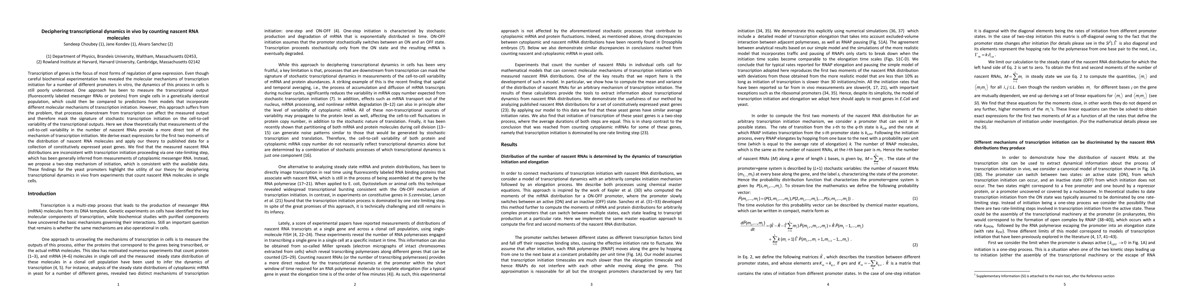 Transcription of genes is the focus of most forms of regulation of gene expression. Even though careful biochemical experimentation has revealed the molecular mechanisms of transcription initiation for a number of different promoters in vitro, the dynamics of this process in cells is still poorly understood. One approach has been to measure the transcriptional output (fluorescently labeled messenger RNAs or proteins) from single cells in a genetically identical population, which could then be compared to predictions from models that incorporate different molecular mechanisms of transcription initiation. However, this approach suffers from the problem, that processes downstream from transcription can affect the measured output and therefore mask the signature of stochastic transcription initiation on the cell-to-cell variability of the transcriptional outputs. Here we show theoretically that measurements of the cell-to-cell variability in the number of nascent RNAs provide a more direct test of the mechanism of transcription initiation. We derive exact expressions for the first two moments of the distribution of nascent RNA molecules and apply our theory to published data for a collection of constitutively expressed yeast genes. We find that the measured nascent RNA distributions are inconsistent with transcription initiation proceeding via one rate-limiting step, which has been generally inferred from measurements of cytoplasmic messenger RNA. Instead, we propose a two-step mechanism of initiation, which is consistent with the available data. These findings for the yeast promoters highlight the utility of our theory for deciphering transcriptional dynamics in vivo from experiments that count nascent RNA molecules in single cells.