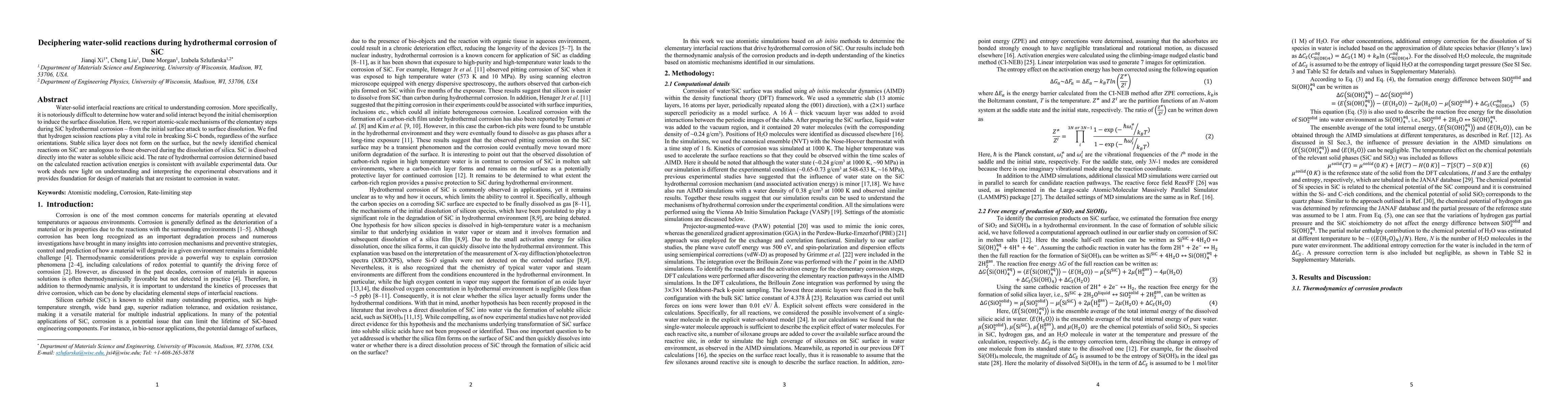 Water solid interfacial reactions are critical to understanding corrosion. More specifically, it is notoriously difficult to determine how water and solid interact beyond the initial chemisorption to induce the surface dissolution. Here, we report atomic-scale mechanisms of the elementary steps during SiC hydrothermal corrosion, from the initial surface attack to surface dissolution. We find that hydrogen scission reactions play a vital role in breaking Si-C bonds, regardless of the surface orientations. Stable silica layer does not form on the surface, but the newly identified chemical reactions on SiC are analogous to those observed during the dissolution of silica. SiC is dissolved directly into the water as soluble silicic acid. The rate of hydrothermal corrosion determined based on the calculated reaction activation energies is consistent with available experimental data. Our work sheds new light on understanding and interpreting the experimental observations and it provides foundation for design of materials that are resistant to corrosion in water.