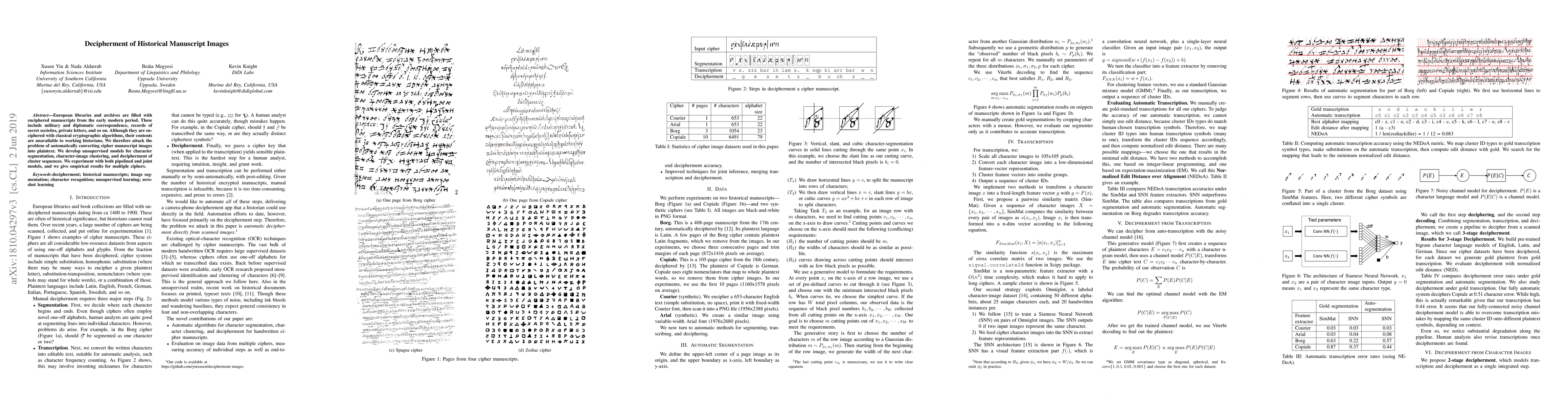 European libraries and archives are filled with enciphered manuscripts from the early modern period. These include military and diplomatic correspondence, records of secret societies, private letters, and so on. Although they are enciphered with classical cryptographic algorithms, their contents are unavailable to working historians. We therefore attack the problem of automatically converting cipher manuscript images into plaintext. We develop unsupervised models for character segmentation, character-image clustering, and decipherment of cluster sequences. We experiment with both pipelined and joint models, and we give empirical results for multiple ciphers.