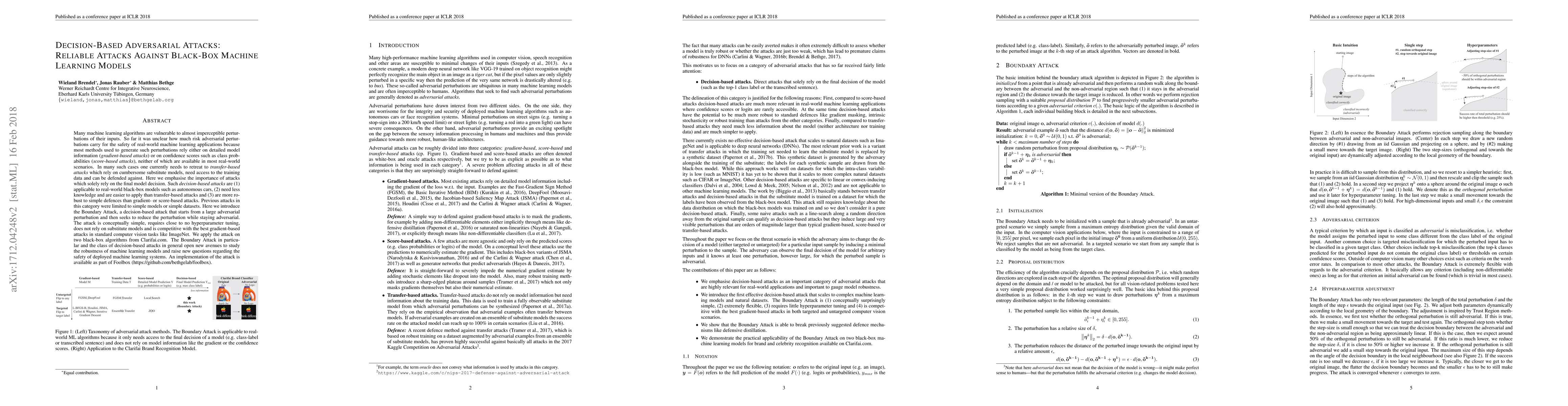 This paper introduces the Boundary Attack, a novel decision-based adversarial attack that can effectively target black-box machine learning models without requiring any model or training data information. The attack is robust, simple, and competitive with gradient-based attacks, highlighting the vulnerability of real-world machine learning systems.