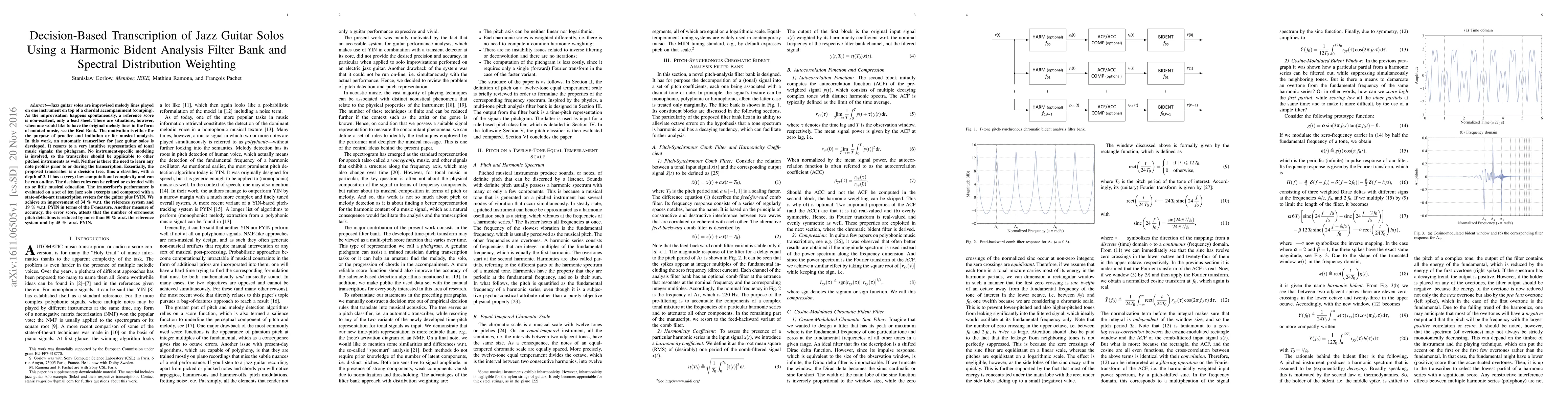 This paper presents an automatic transcriber for jazz guitar solos using a harmonic Bident Analysis Filter Bank and spectral distribution weighting, achieving a 34% improvement over a state-of-the-art system in F-measure and reducing error detections by over 50%. The method employs a low-complexity decision tree classifier that can be refined easily without requiring musical expertise.