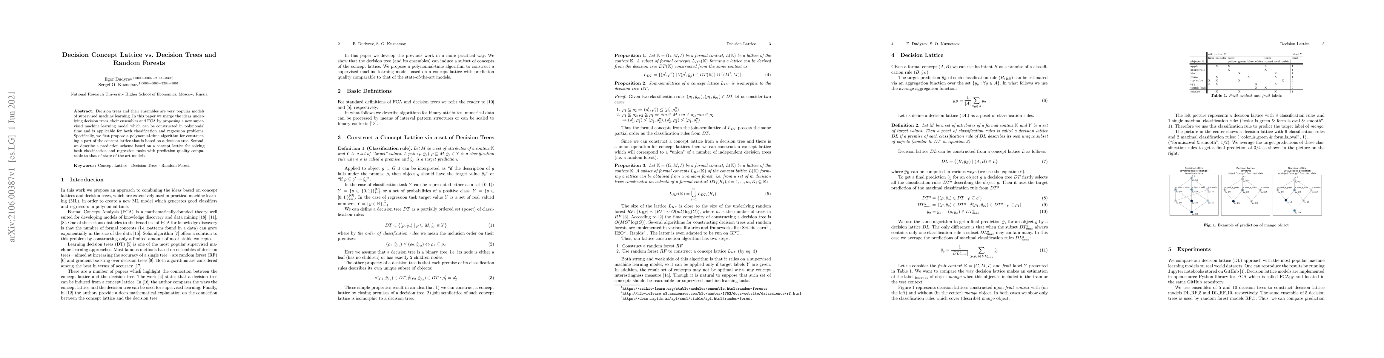 Decision trees and their ensembles are very popular models of supervised machine learning. In this paper we merge the ideas underlying decision trees, their ensembles and FCA by proposing a new supervised machine learning model which can be constructed in polynomial time and is applicable for both classification and regression problems. Specifically, we first propose a polynomial-time algorithm for constructing a part of the concept lattice that is based on a decision tree. Second, we describe a prediction scheme based on a concept lattice for solving both classification and regression tasks with prediction quality comparable to that of state-of-the-art models.